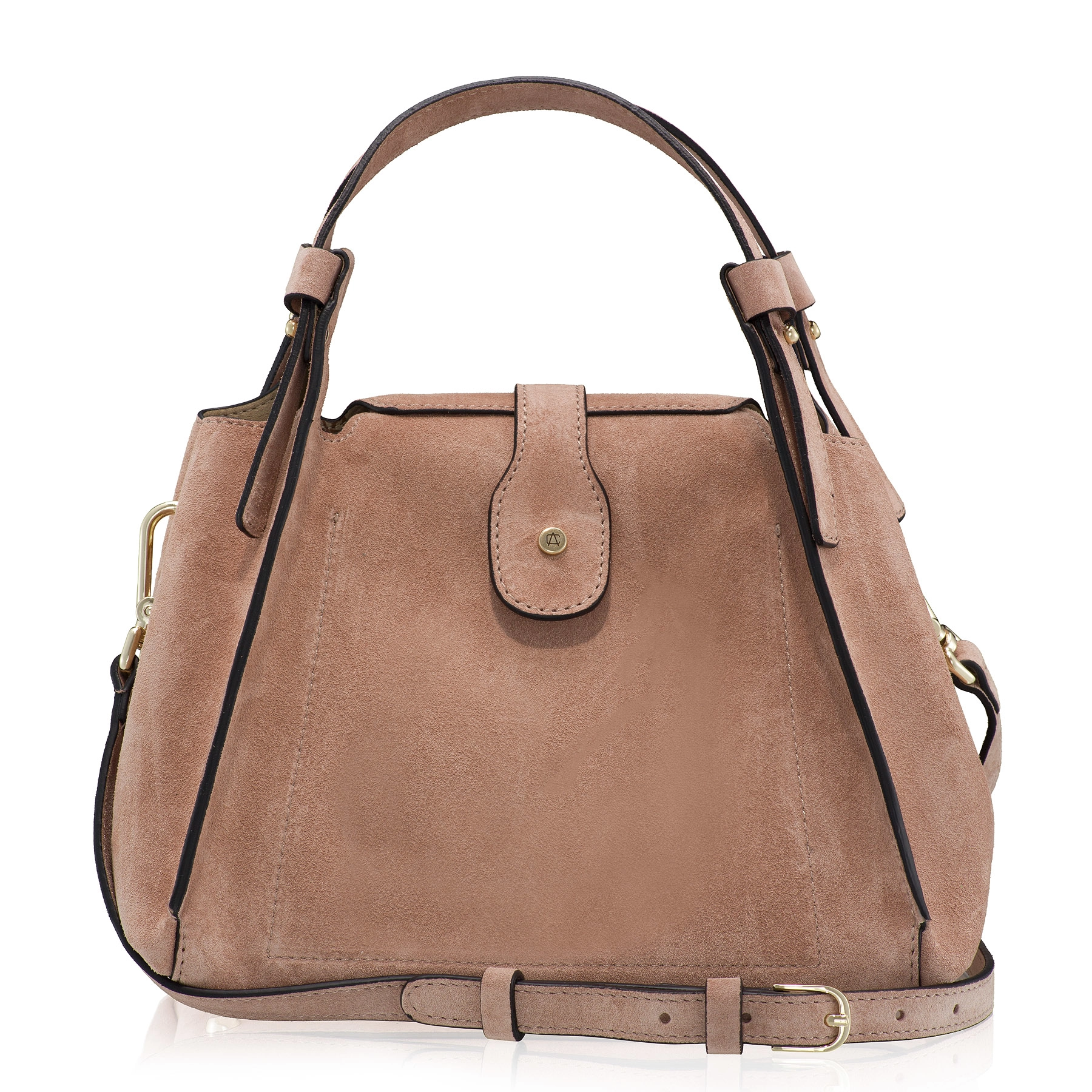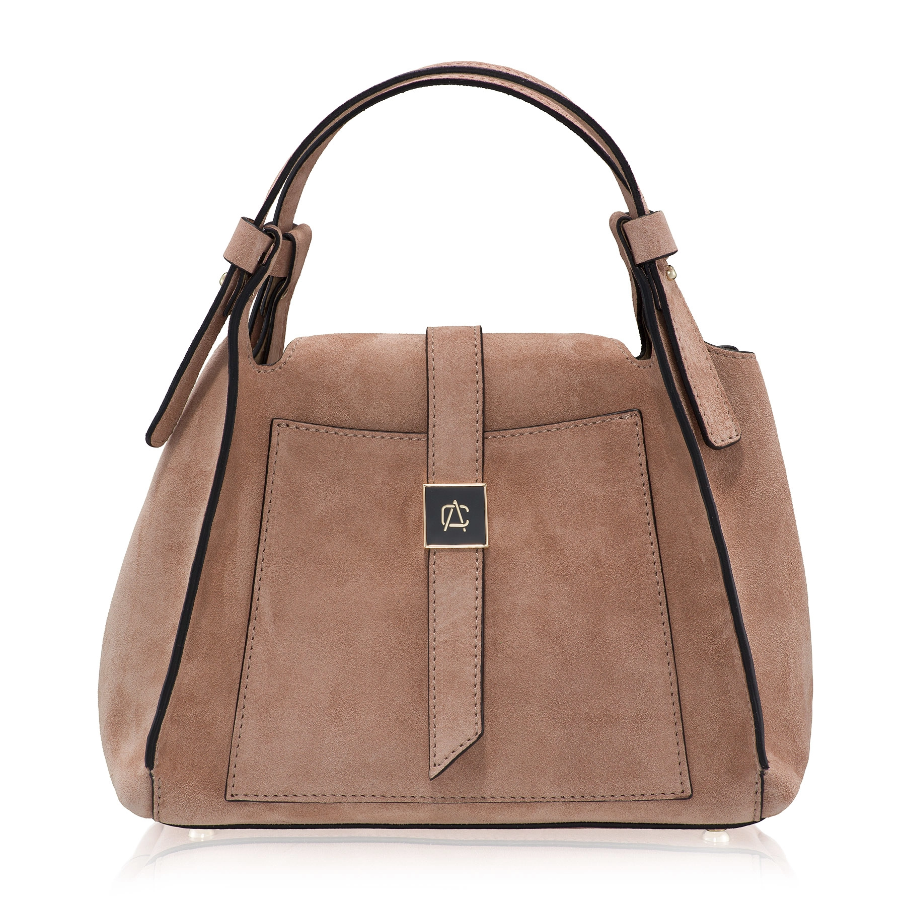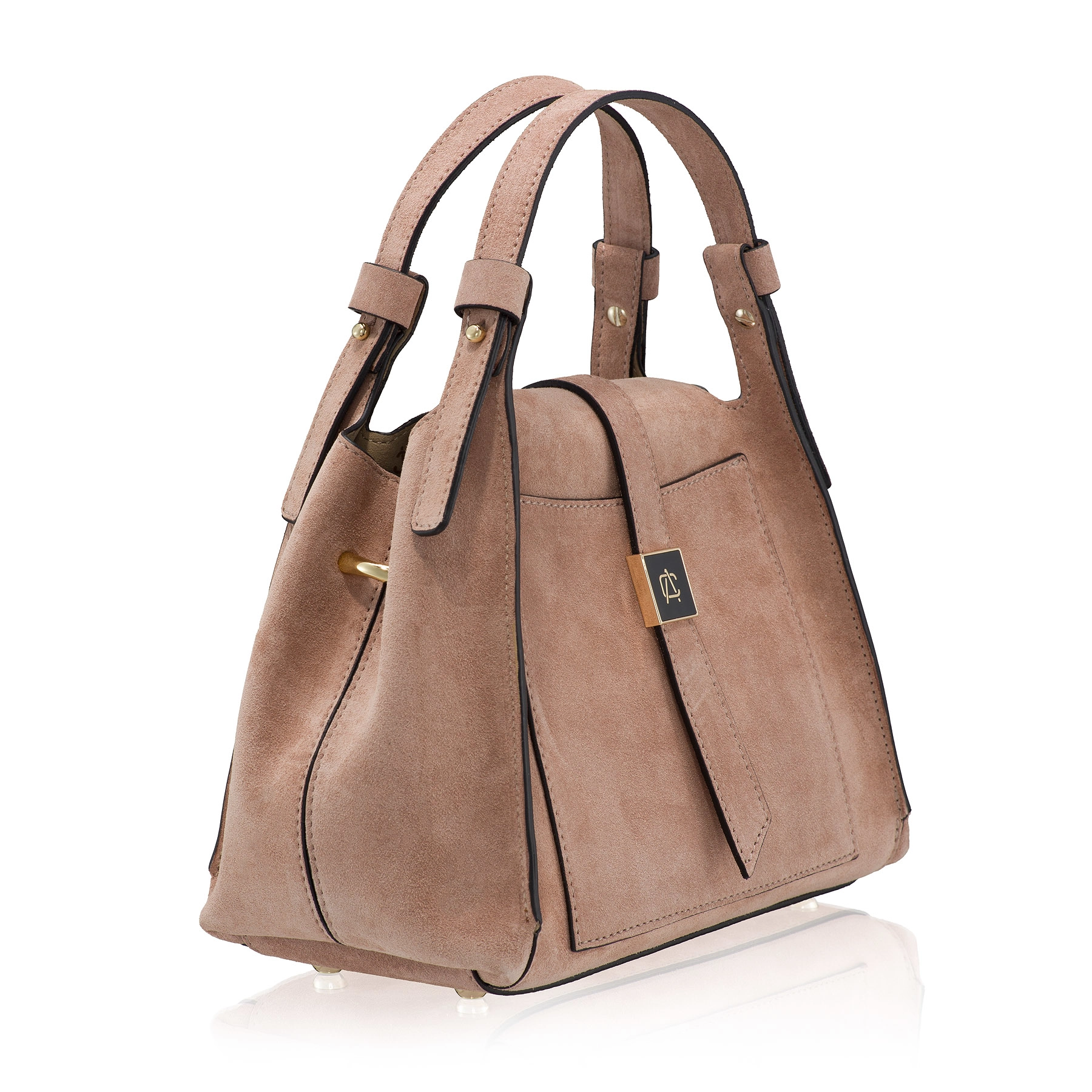 Fabricată din piele întoarsă de înalta calitate, această geantă impresionează prin textură și design sofisticat.