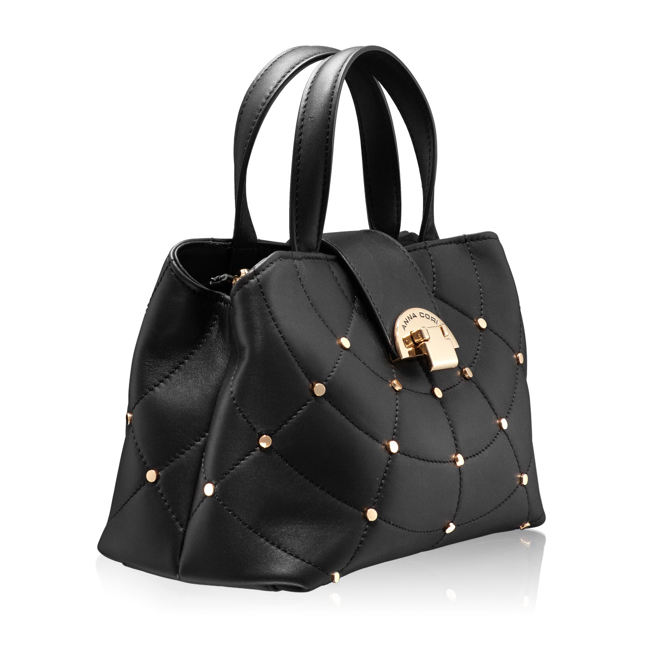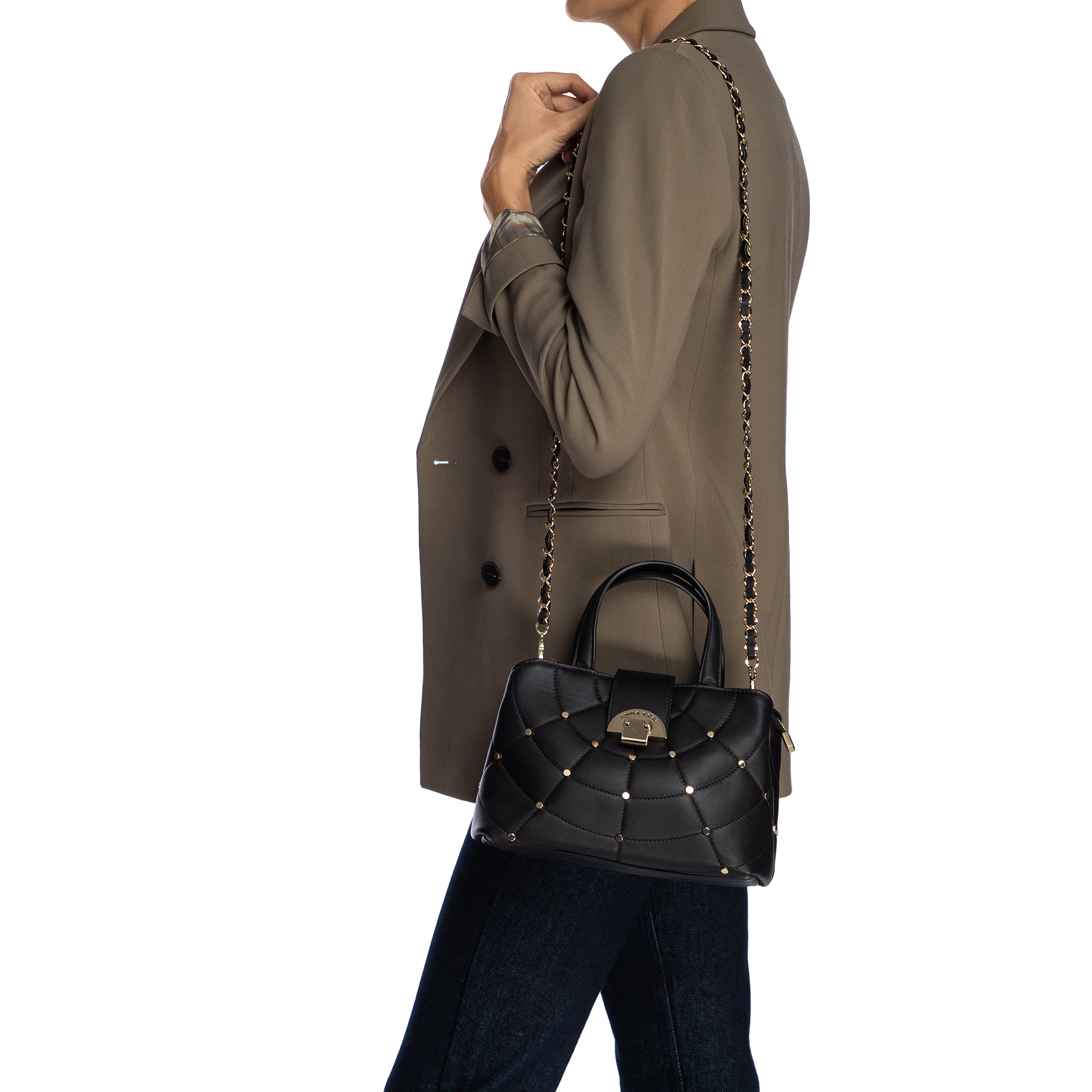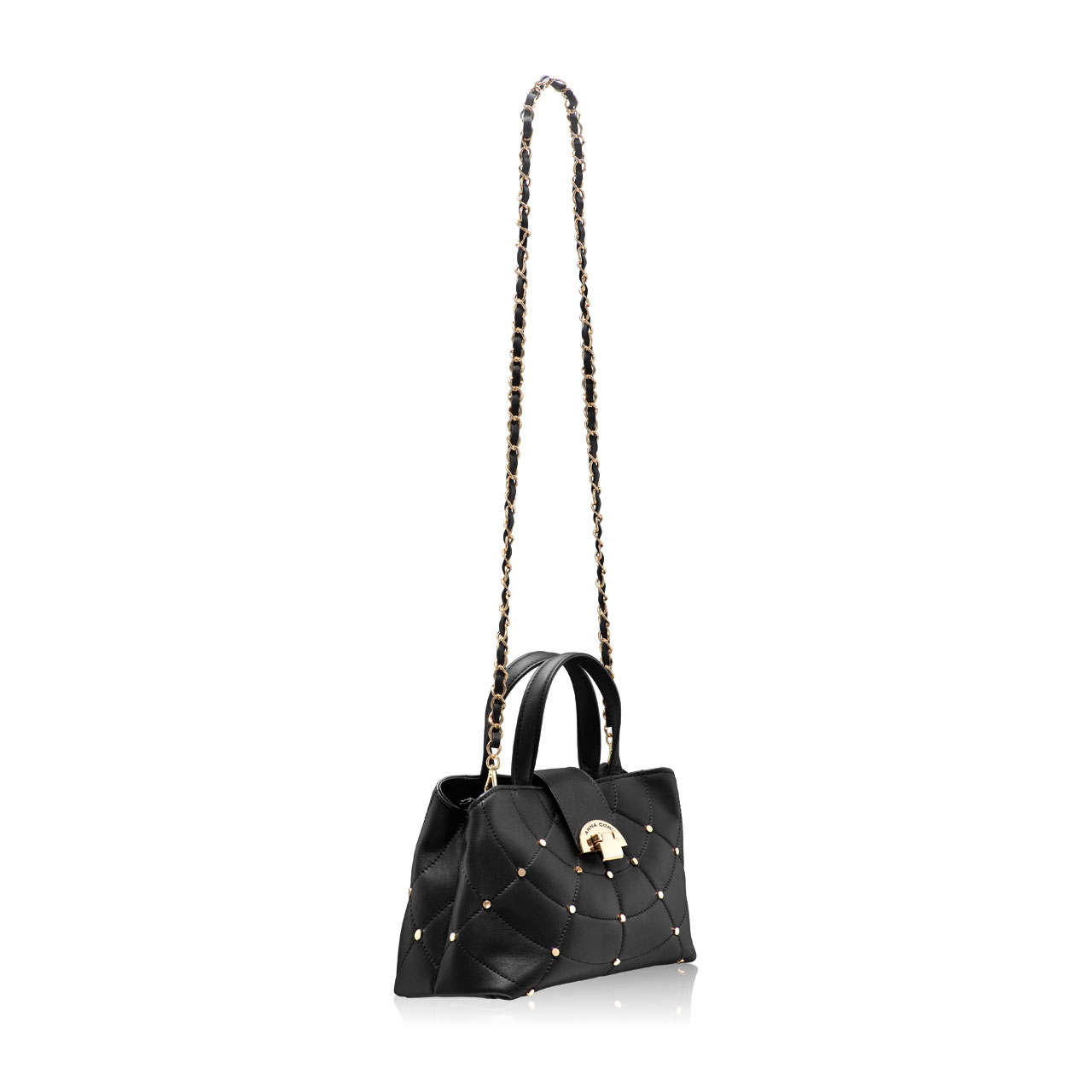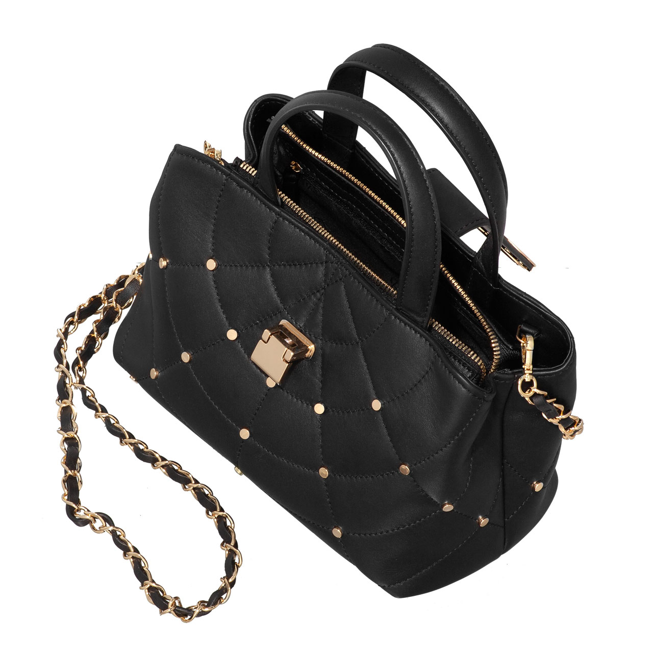 Accesorizată complet cu capse aurii ce formează un model unic, geanta Leona nu trebuie să lipsească din garderoba ta datorită stilului elegant și totodată casual pe care îl poate avea. Mânerul completează silueta acestei genți, iar bareta de umăr formată din lanț auriu și piele, adaugă o notă chic. Este fabricată din piele naturală și conține două compartimente încăpătoare și două buzunare cu fermoar.