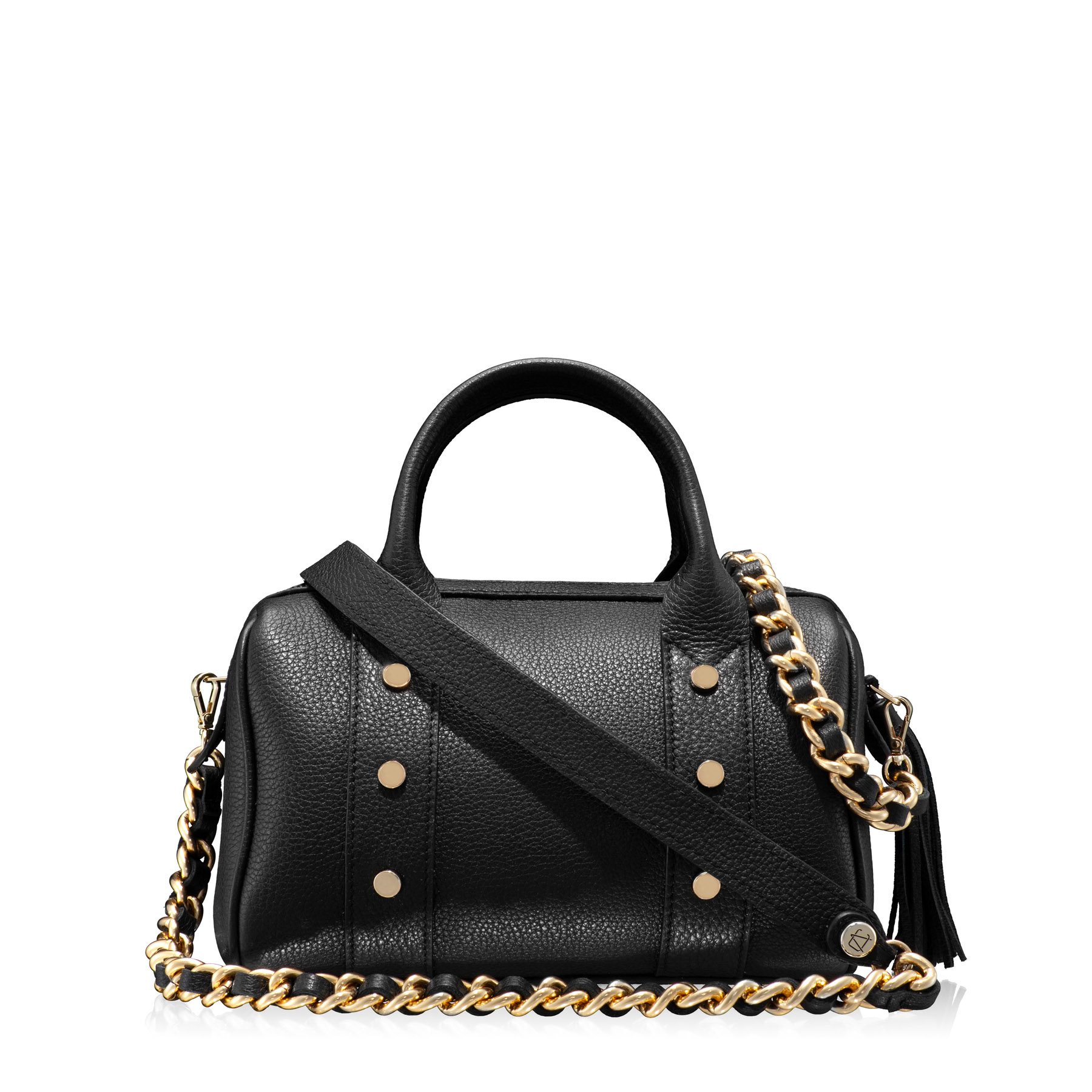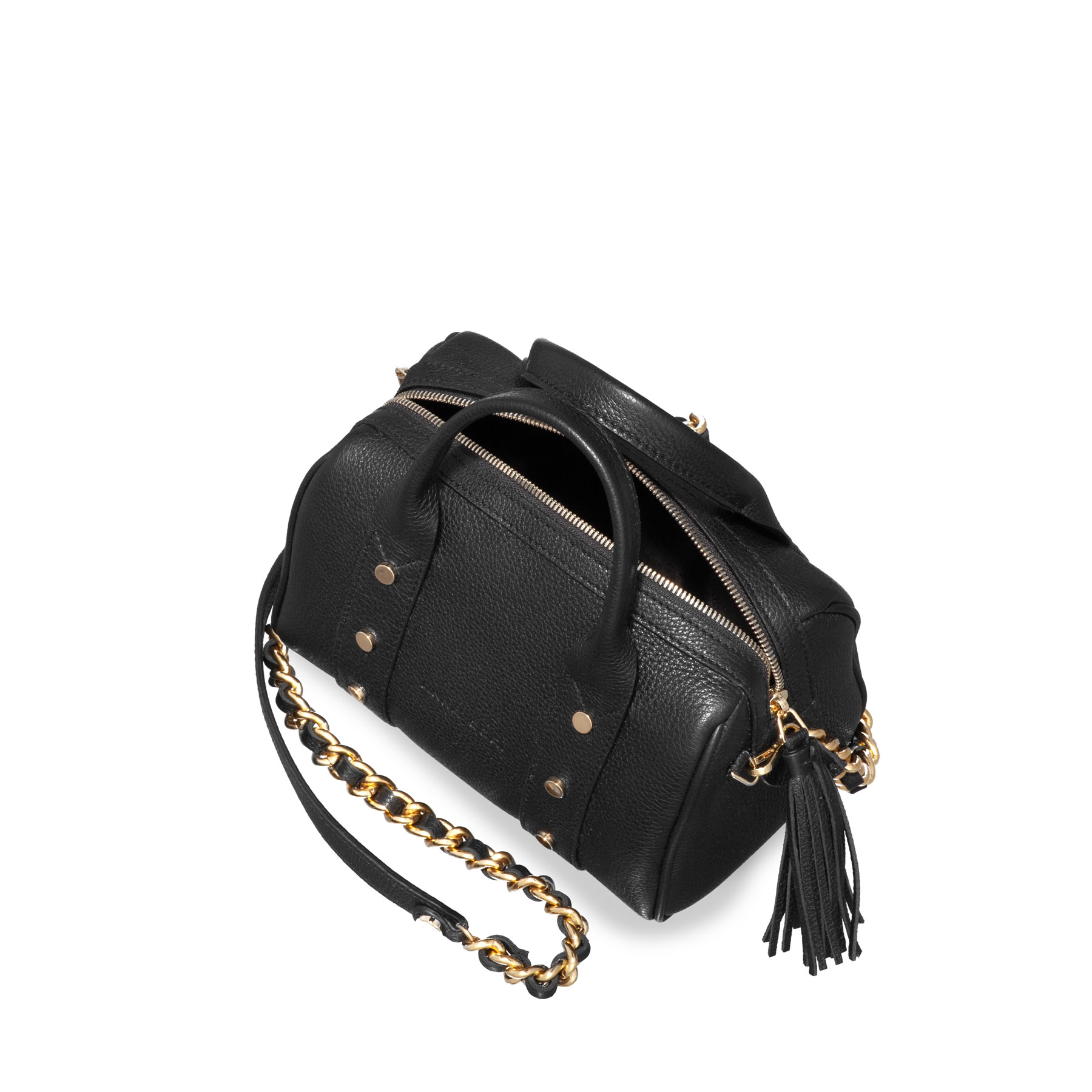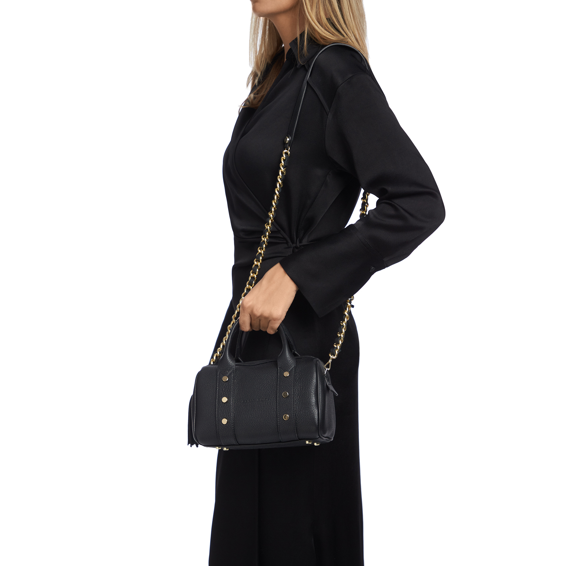 Geanta #PERRY din piele naturală prezintă un stil retro bauletto prin forma sa deosebită. Este accesorizată cu capse metalice aurii, ciucure din piele naturală la fermoar și un lanț metalic auriu de umăr cu piele naturală. Conține un compartiment principal și două buzunare, poate fi purtată atât de mână, cât și pe umăr.