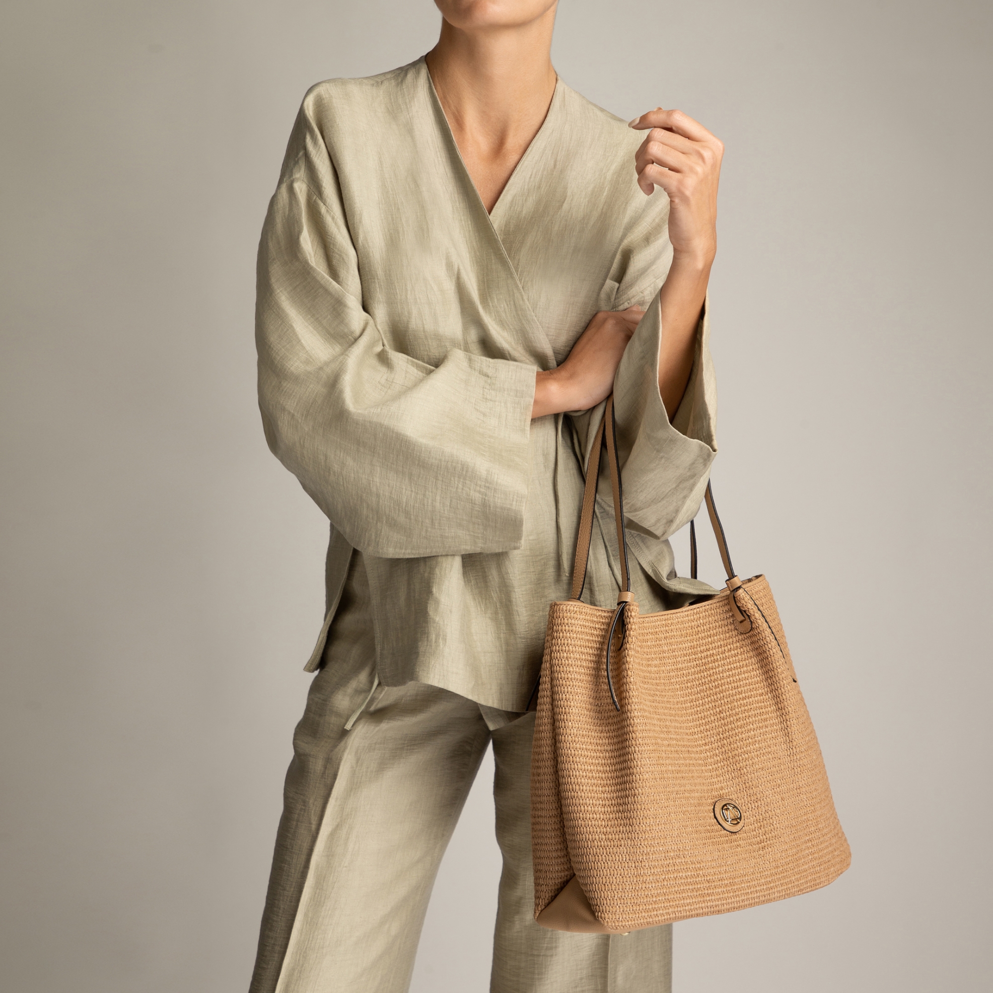 Cu un design rafinat și accente boho-chic, această geantă este realizată din rafie împletită și piele naturală, combinând estetica naturală cu durabilitatea materialelor premium.