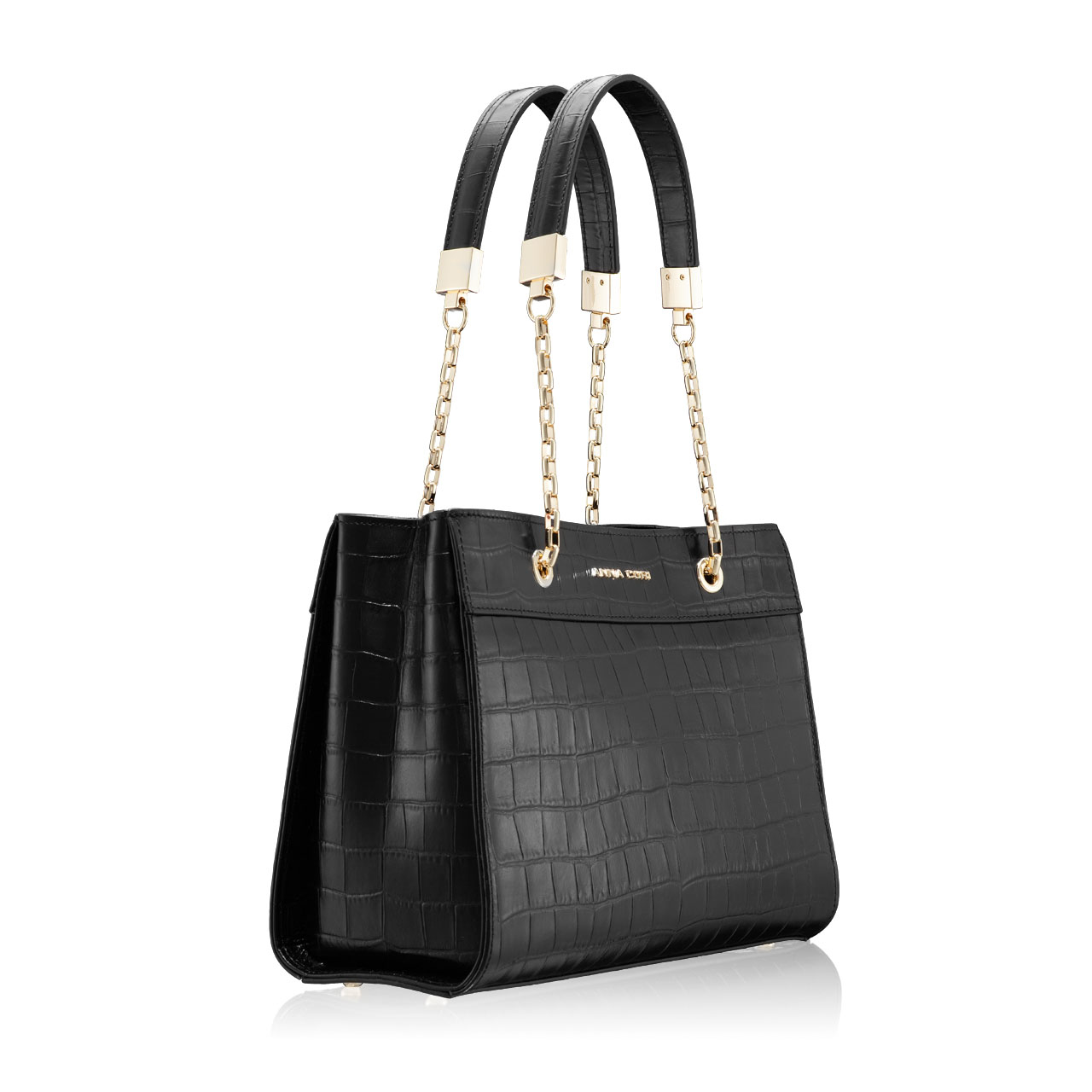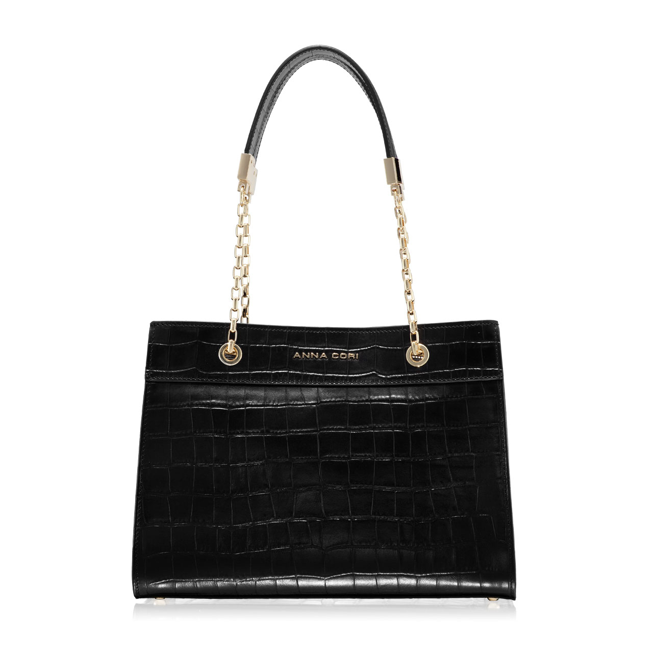 Geanta de umar din piele croco, personalizata cu logo-ul Anna Cori. Este prevazuta cu doua compartimente, despartite de un buzunar inchis cu fermoar, plus un buzunar lateral cu fermoar. Inchiderea se face prin capsa cu magnet.
