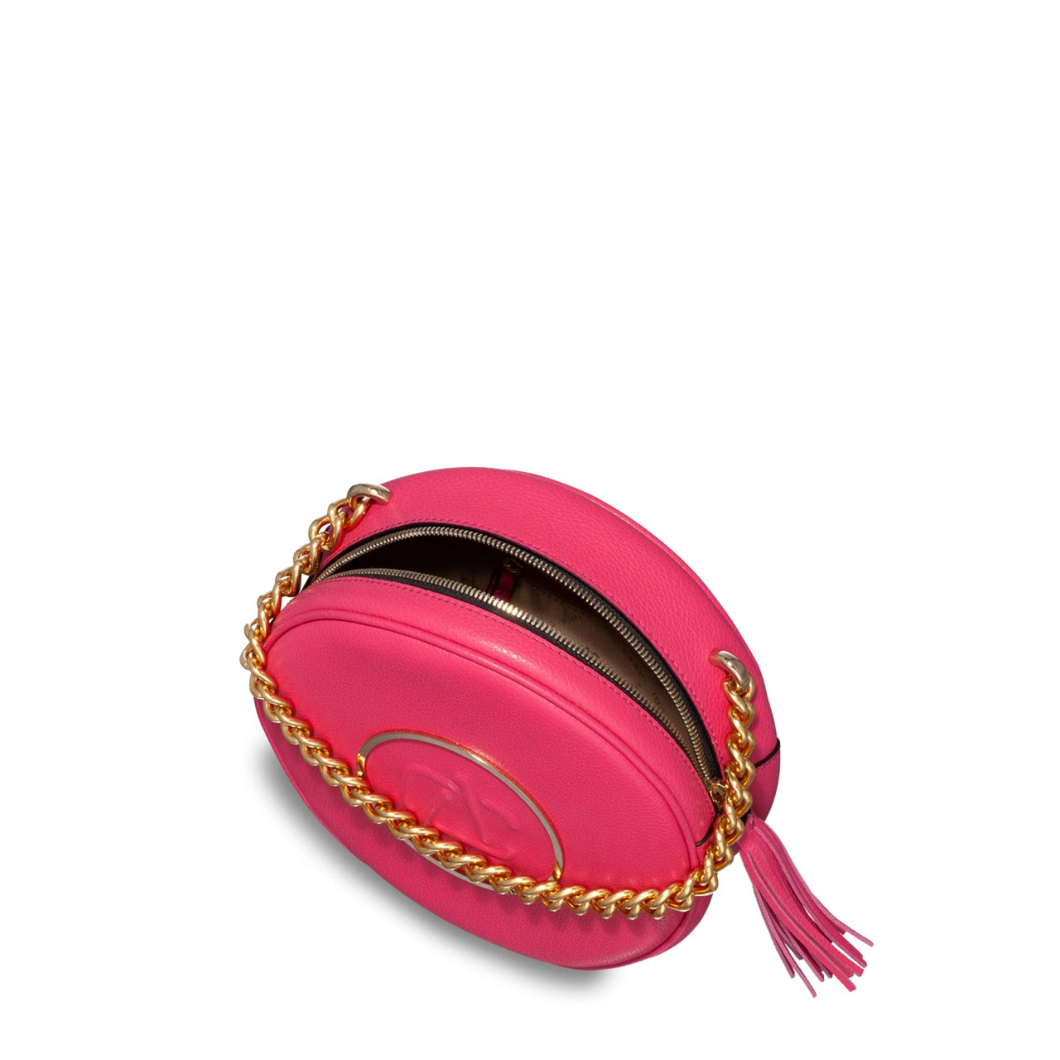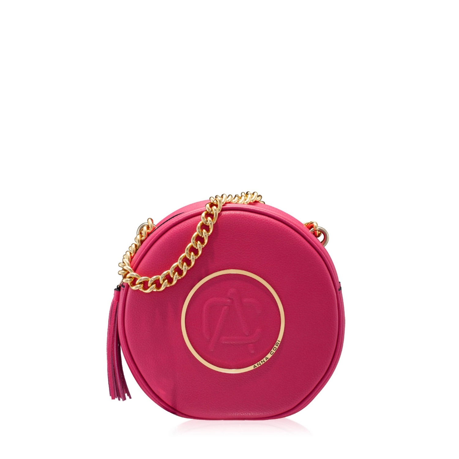 Geanta #TAMARA, într-o formă atemporală, rotundă, este confecționată din piele naturală de vițel și este accesorizată cu elemente deosebite. Cercul metalic auriu din jurul monogramei Anna Cori, scoate în evidență forma geometrică a acestei genți. Geanta este prevăzută cu un lanț metalic auriu de mână, o curea detașabilă și reglabilă și un ciucure din piele naturală la fermoar.