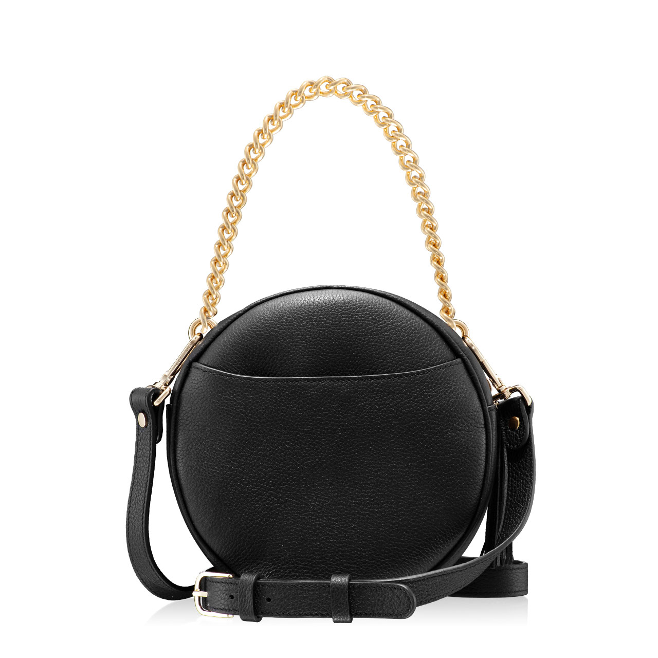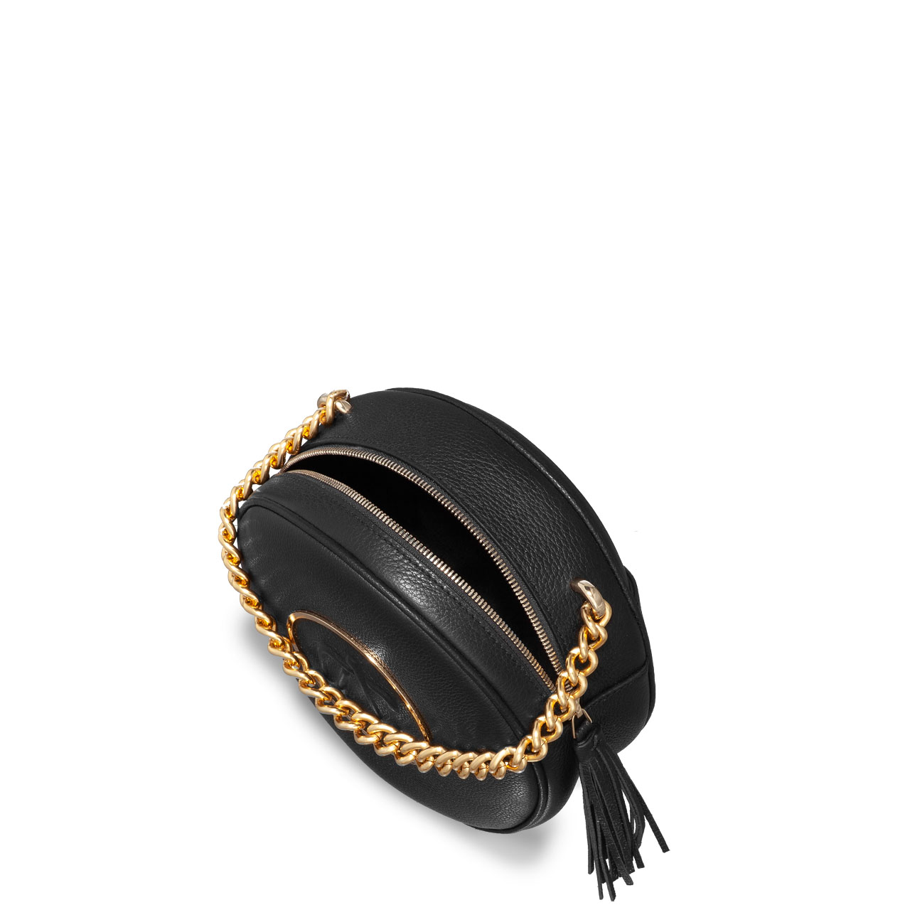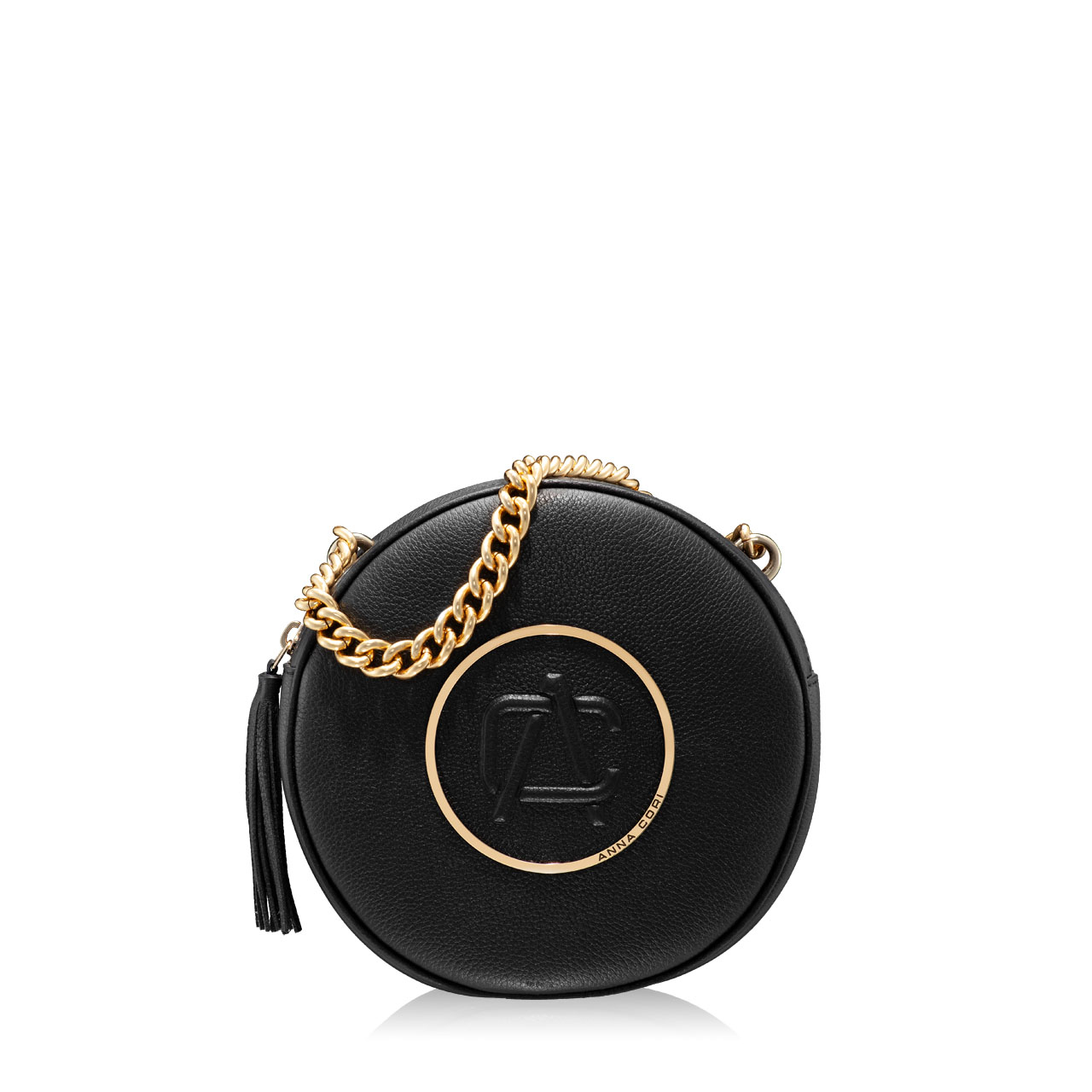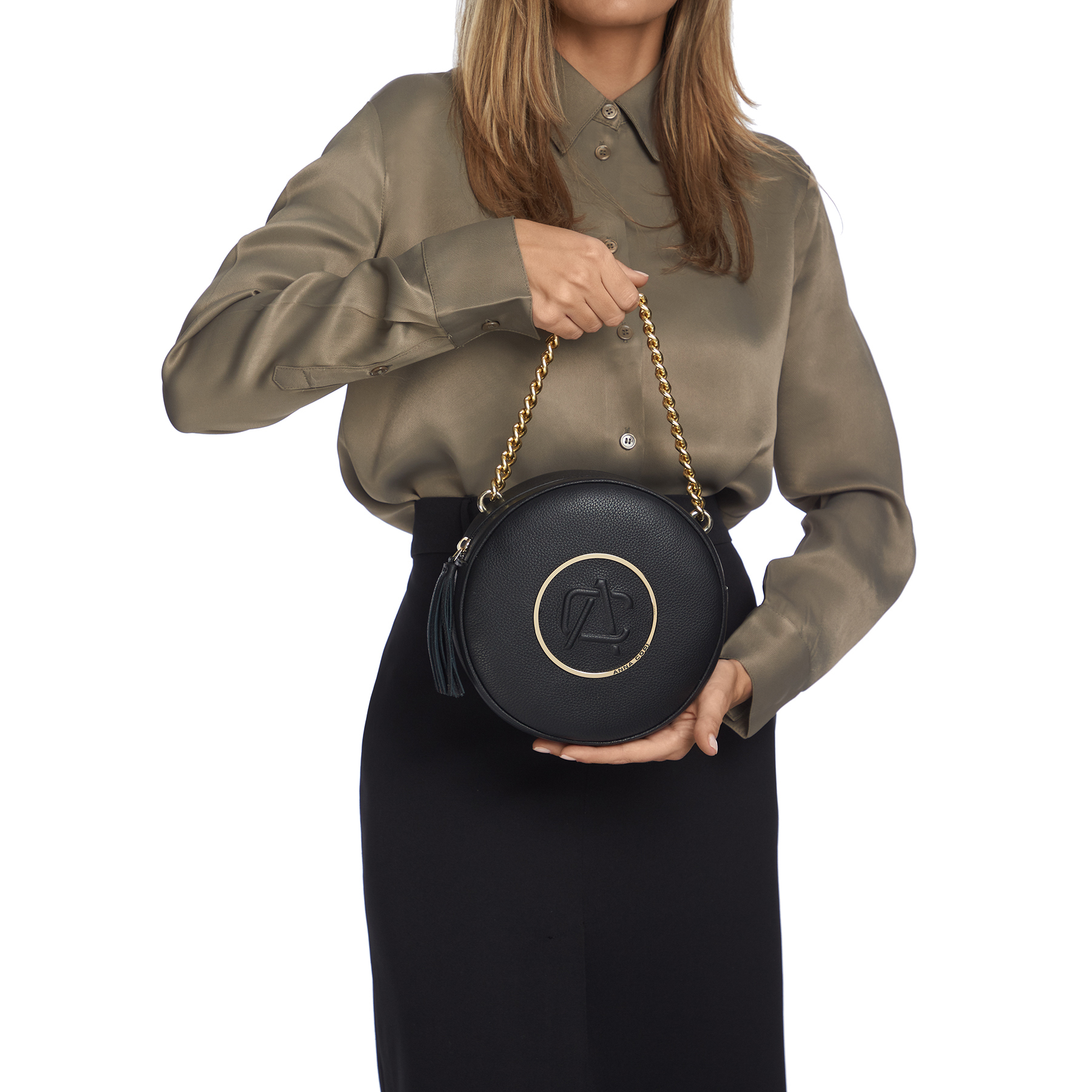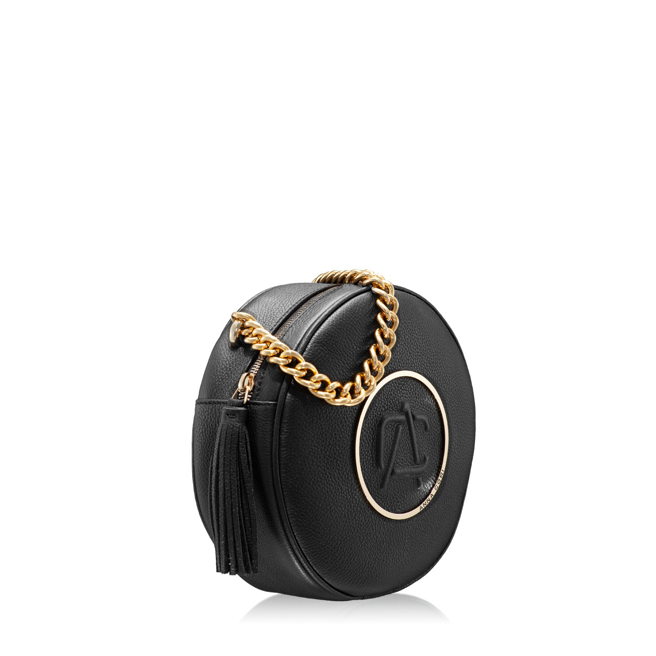 Geanta #TAMARA, într-o formă atemporală, rotundă, este confecționată din piele naturală de vițel și este accesorizată cu elemente deosebite. Cercul metalic auriu din jurul monogramei Anna Cori, scoate în evidență forma geometrică a acestei genți. Geanta este prevăzută cu un lanț metalic auriu de mână, o curea detașabilă și reglabilă și un ciucure din piele naturală la fermoar.