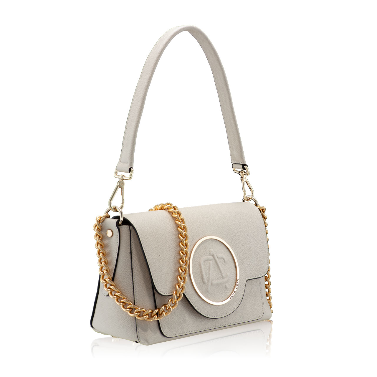 Geanta de umăr #TANIA este accesorizată cu emblematica monogramă Anna Cori evidențiată cu un detaliu auriu aduce un plus de strălucire. Această geantă poate fi purtată pe umăr prin mânerul detașabil din piele naturală sau poate fi purtată crossbody datorită lanțului de umăr.