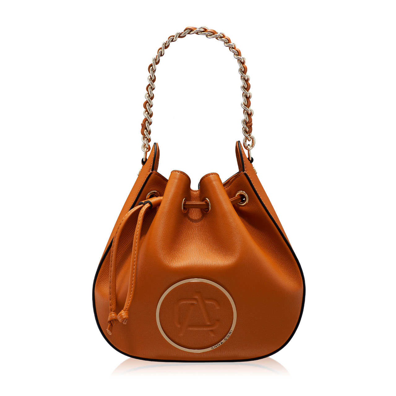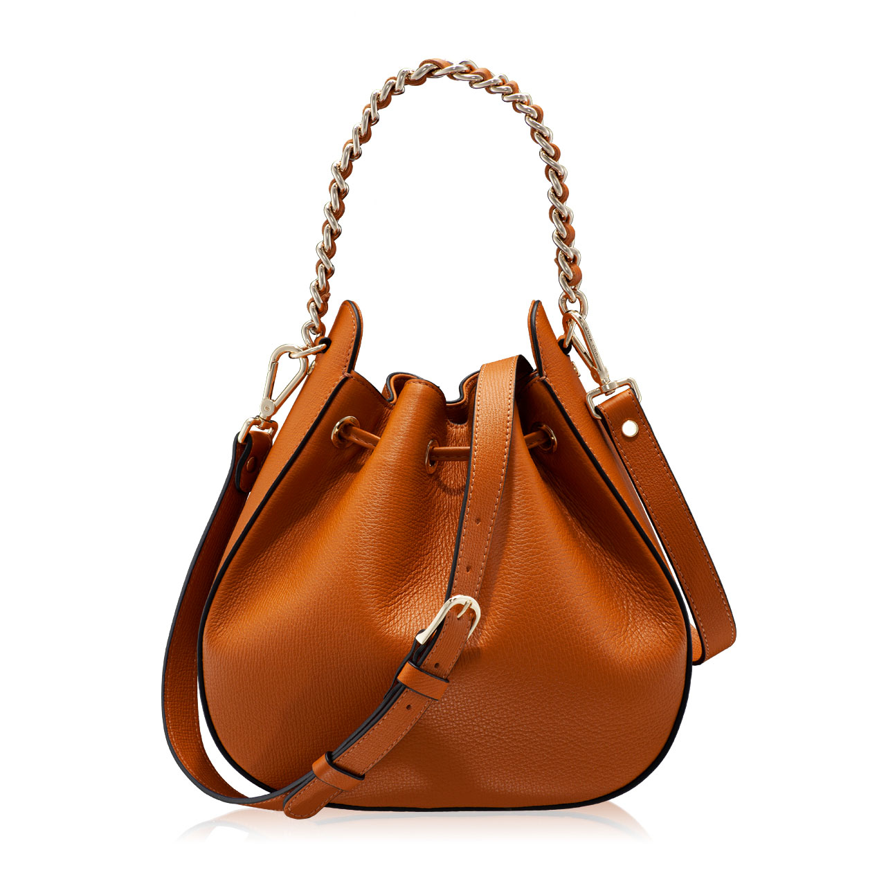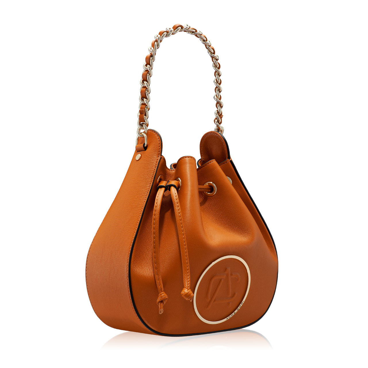 Fabricată din piele de vițel moale, geanta #THEA are o formă deosebită definită de o închidere cu șnur și accesorii aurii. Poate fi purtată în mână prin mânerul realizat din lanț metalic și piele naturală, sau poate fi purtată crossbody prin cureaua reglabilă și detașabilă.