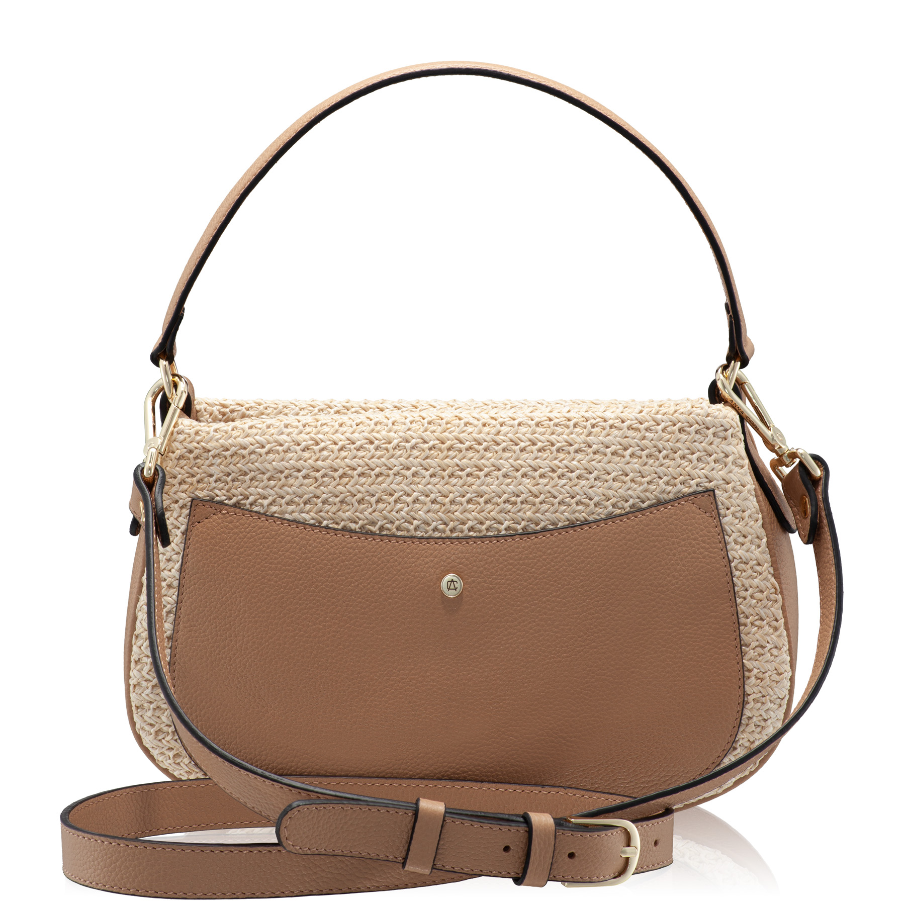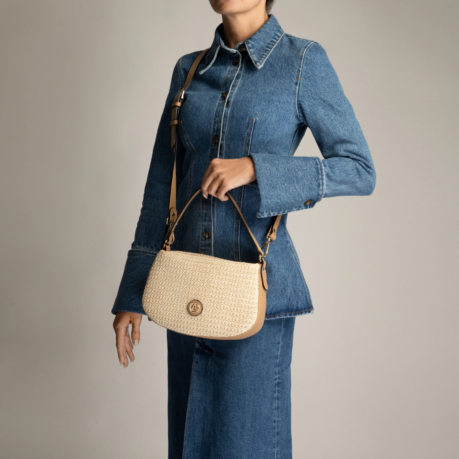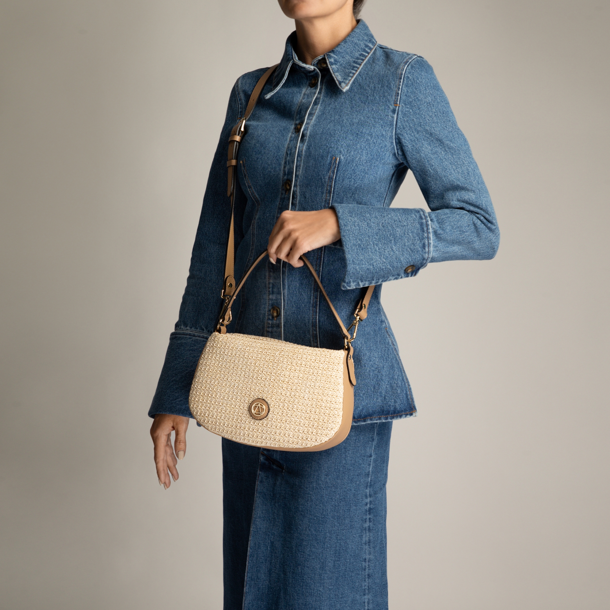 - Piele naturală de înaltă calitate + material textil tip rafie