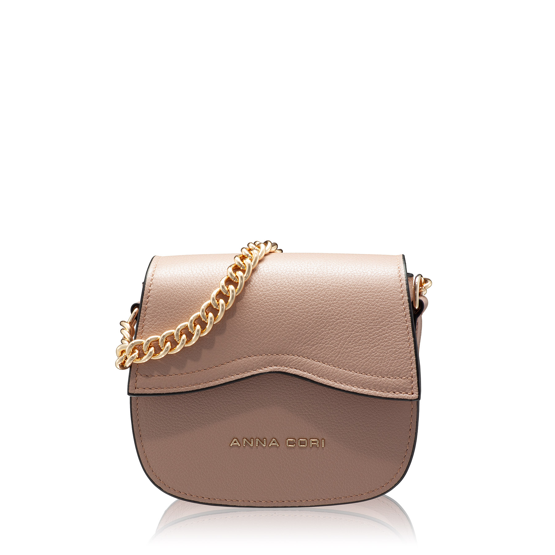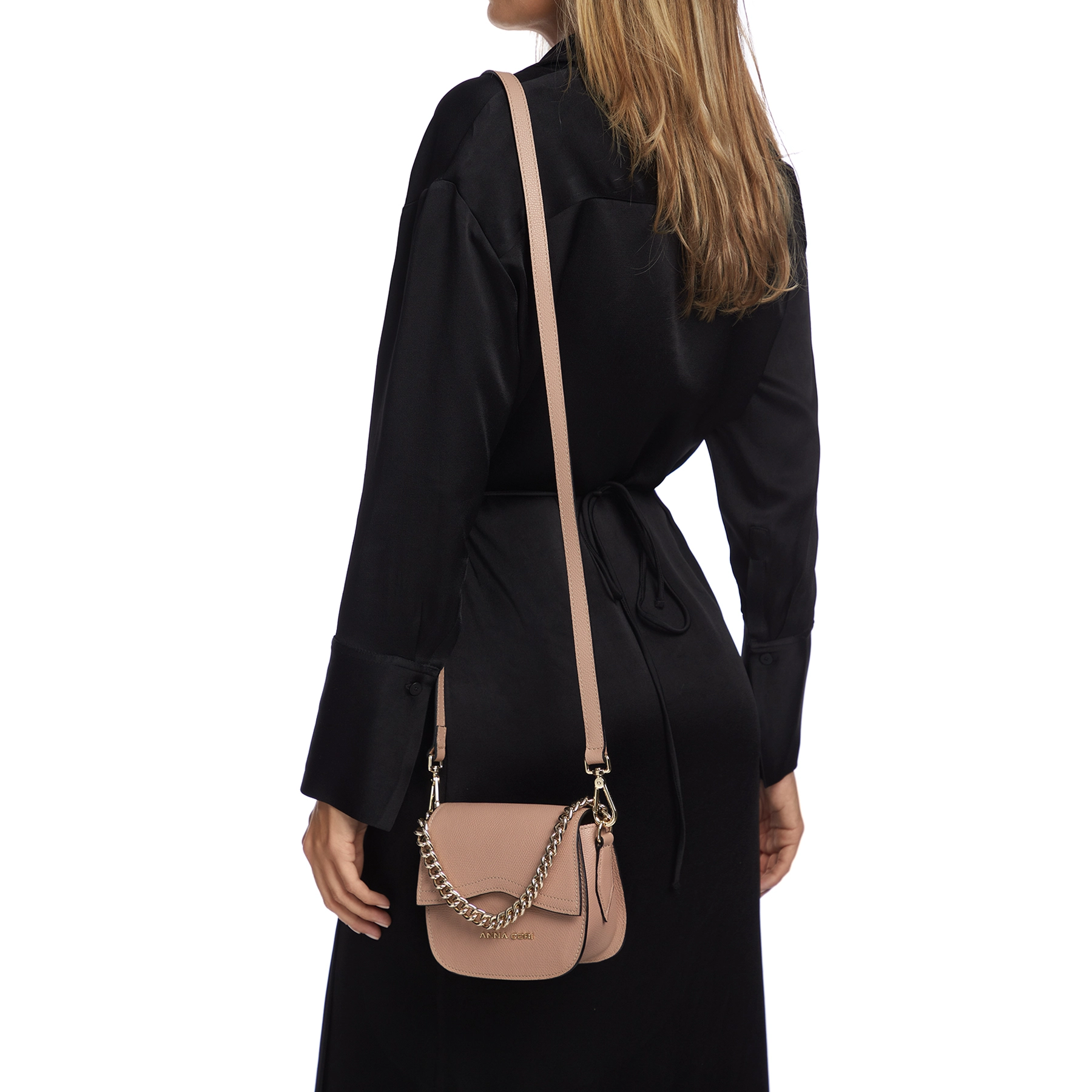 Mini geanta #NEVADA este realizată din piele naturală de vițel, cu o textură fină și accesorizată cu logo-ul Anna Cori. Este prevăzută cu lanț metalic auriu și o curea din piele naturală pentru a fi purtată crossbody.