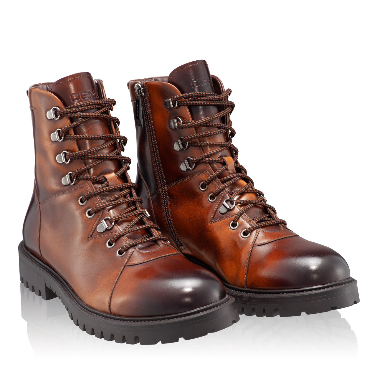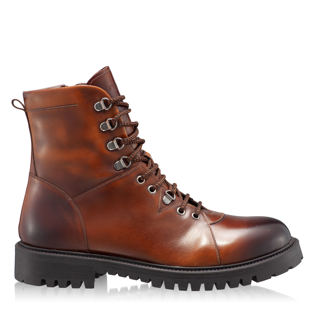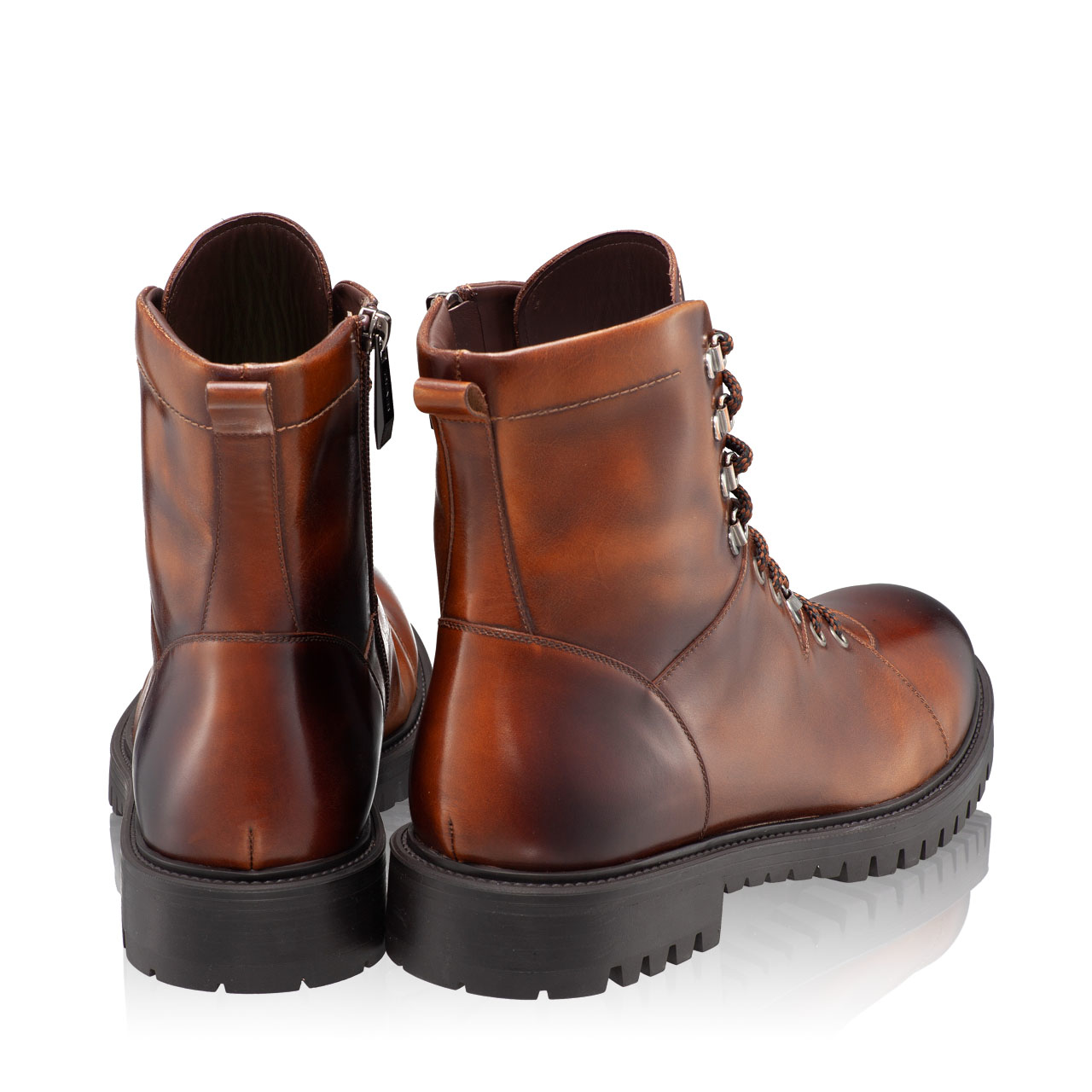 Ghete barbati din piele naturala, cu finisaj manual. Inchiderea se face cu fermoar. Sunt prevazute cu siret si sunt captusite cu blana.
