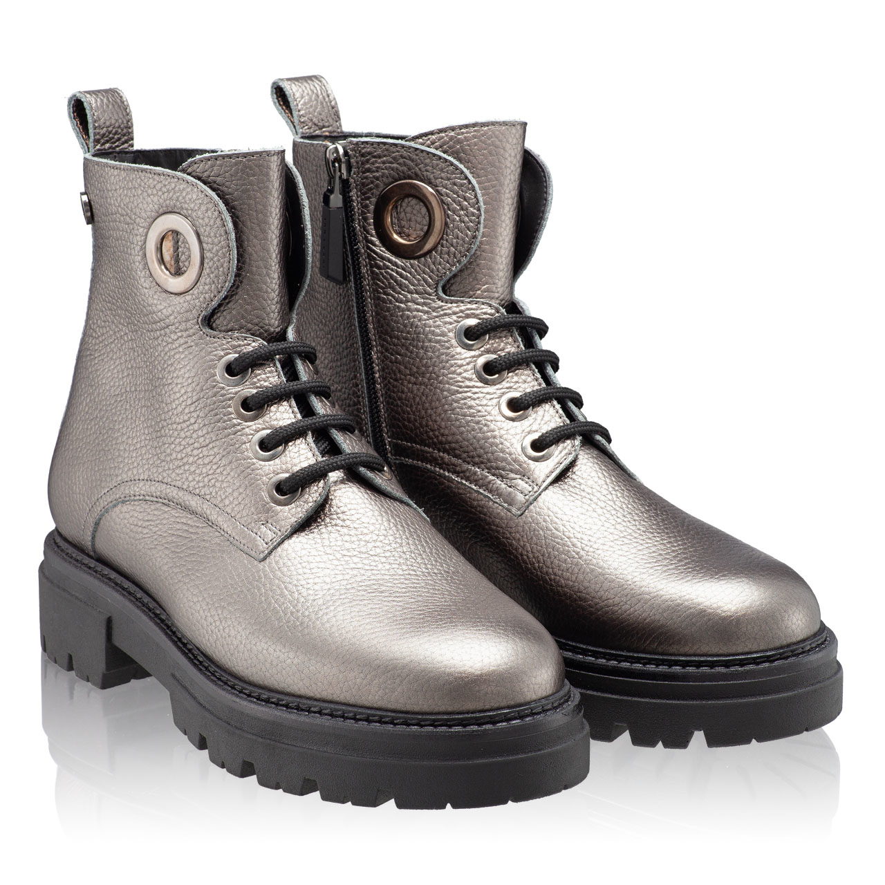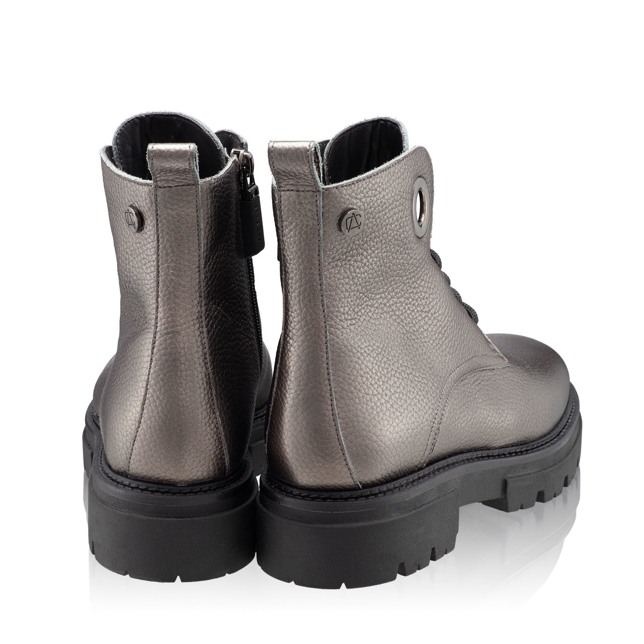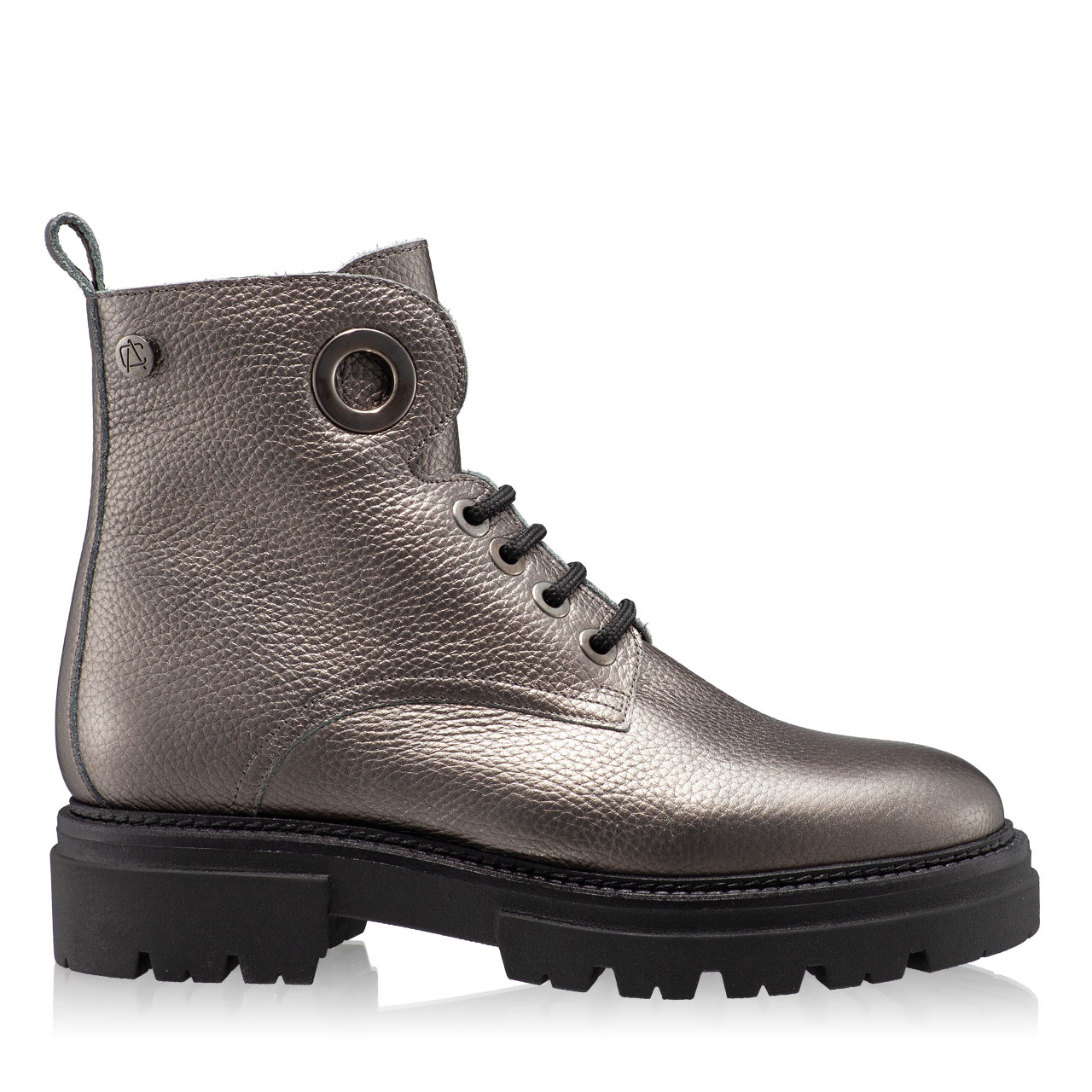 Ghete dama din piele naturala, prevazute cu monograma Anna Cori. Inchiderea se face cu fermoar lateral, iar inaltimea tocului este de 20mm. In interior sunt captusite cu blana.