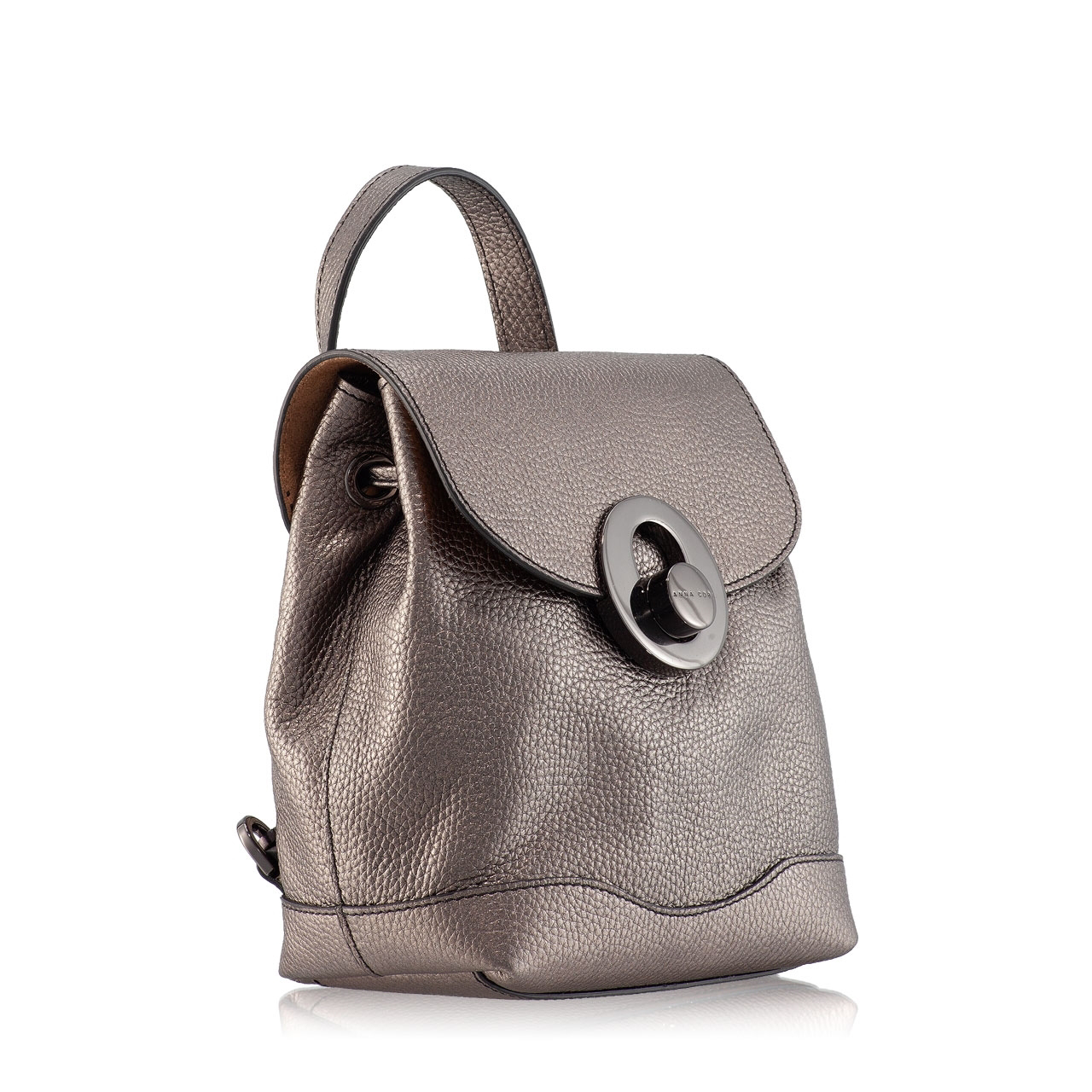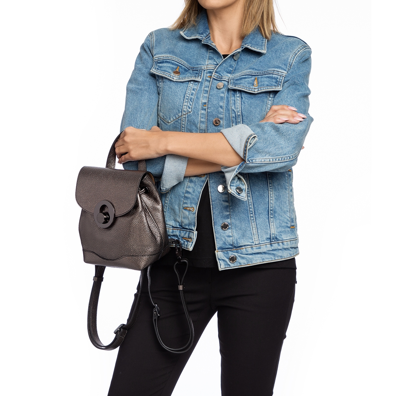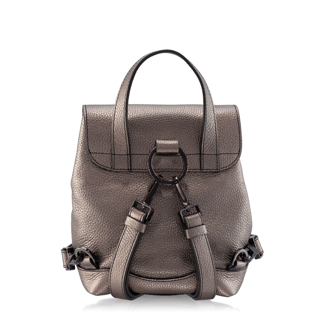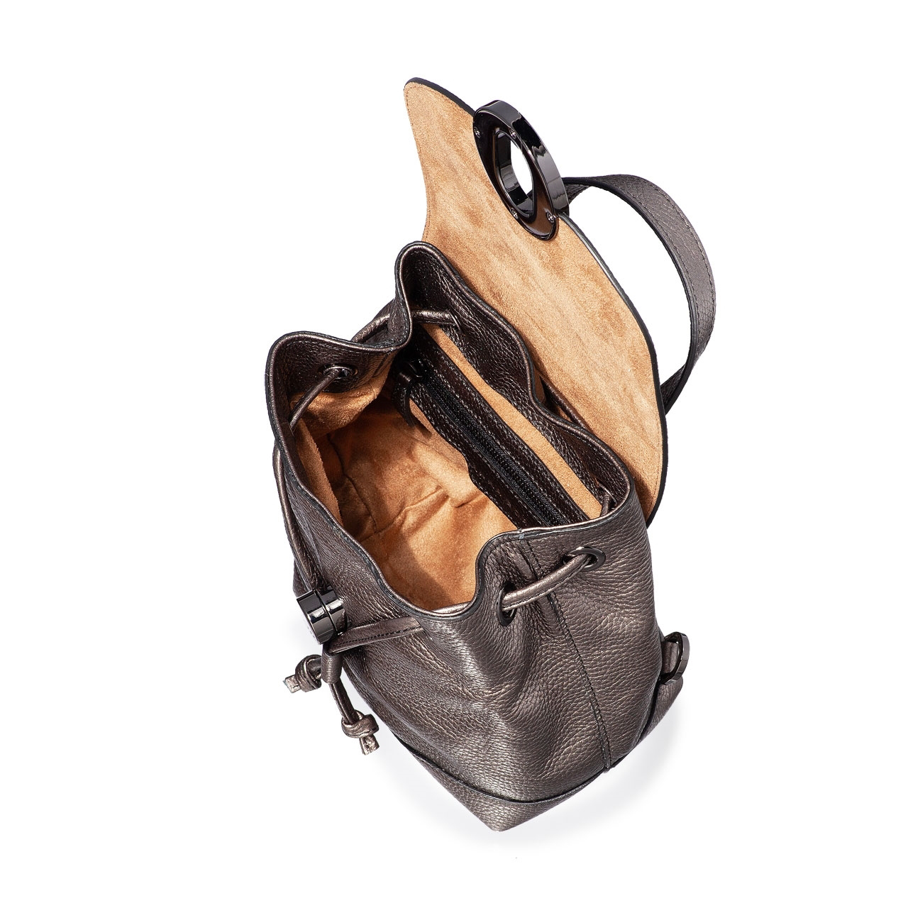 Rucsac dama din piele naturala cu accesorii personalizate.Este prevazut cu un singur compartiment si un buzunar interior cu fermoar.Baretele de umar sunt ajustabile si detasabile.
