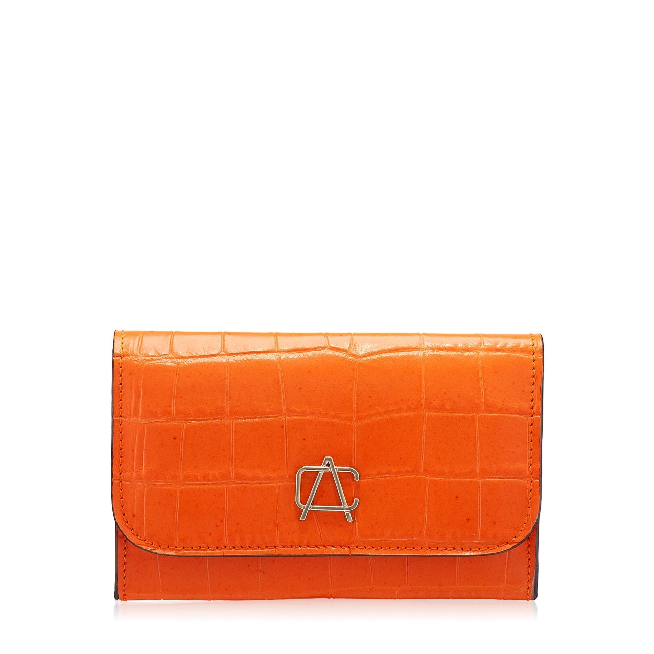 Portofel dama din piele cocco accesorizat cu monograma Anna Cori. La interior, este prevazut cu doua compartimente, doua spatii pentru carduri si un buzunar cu fermoar.