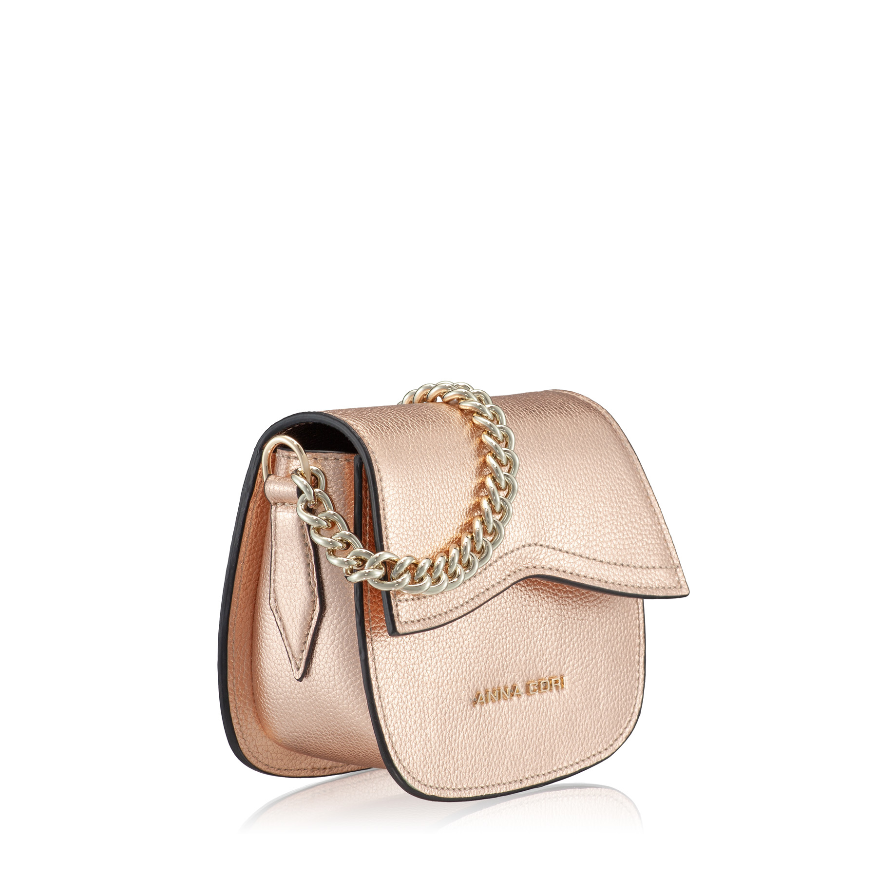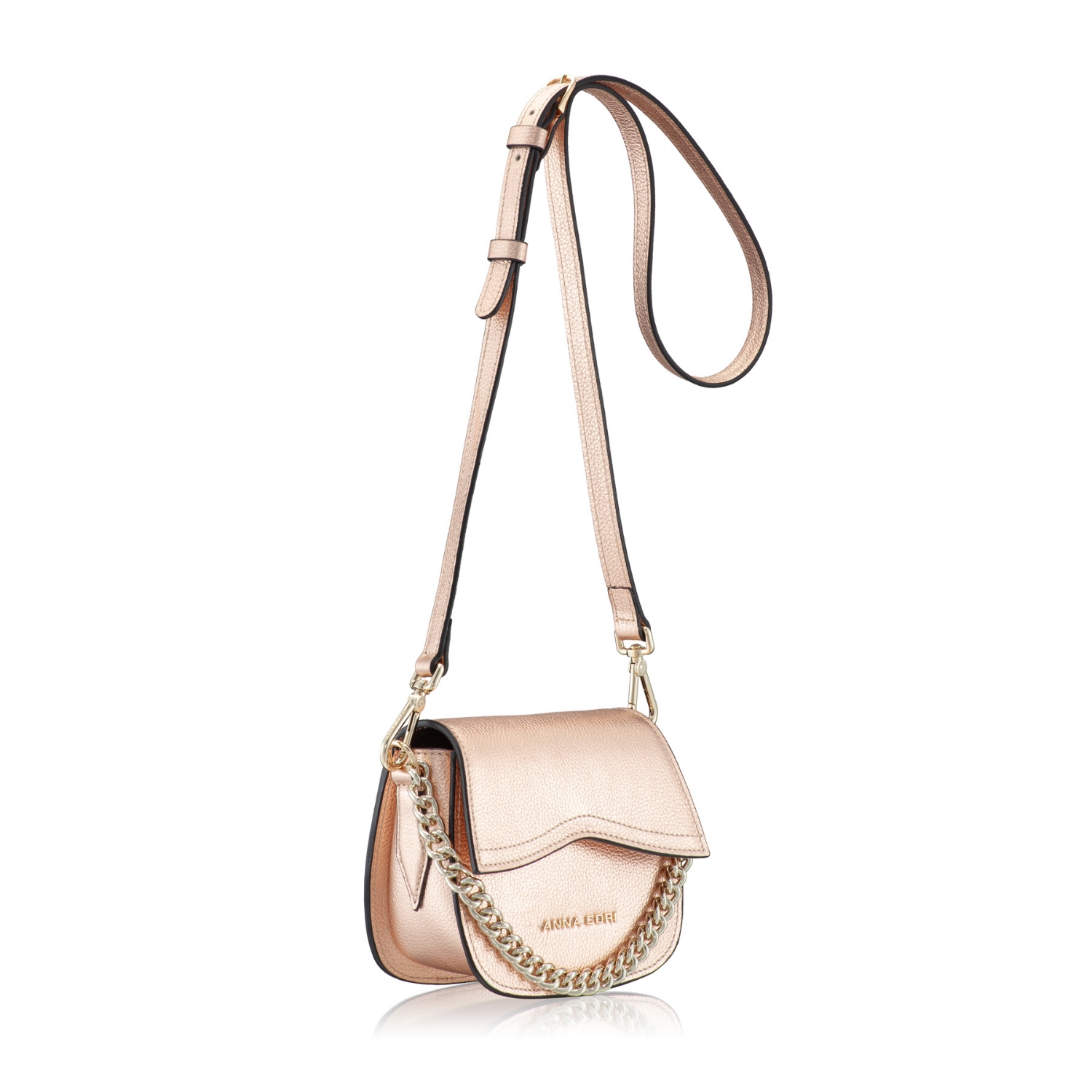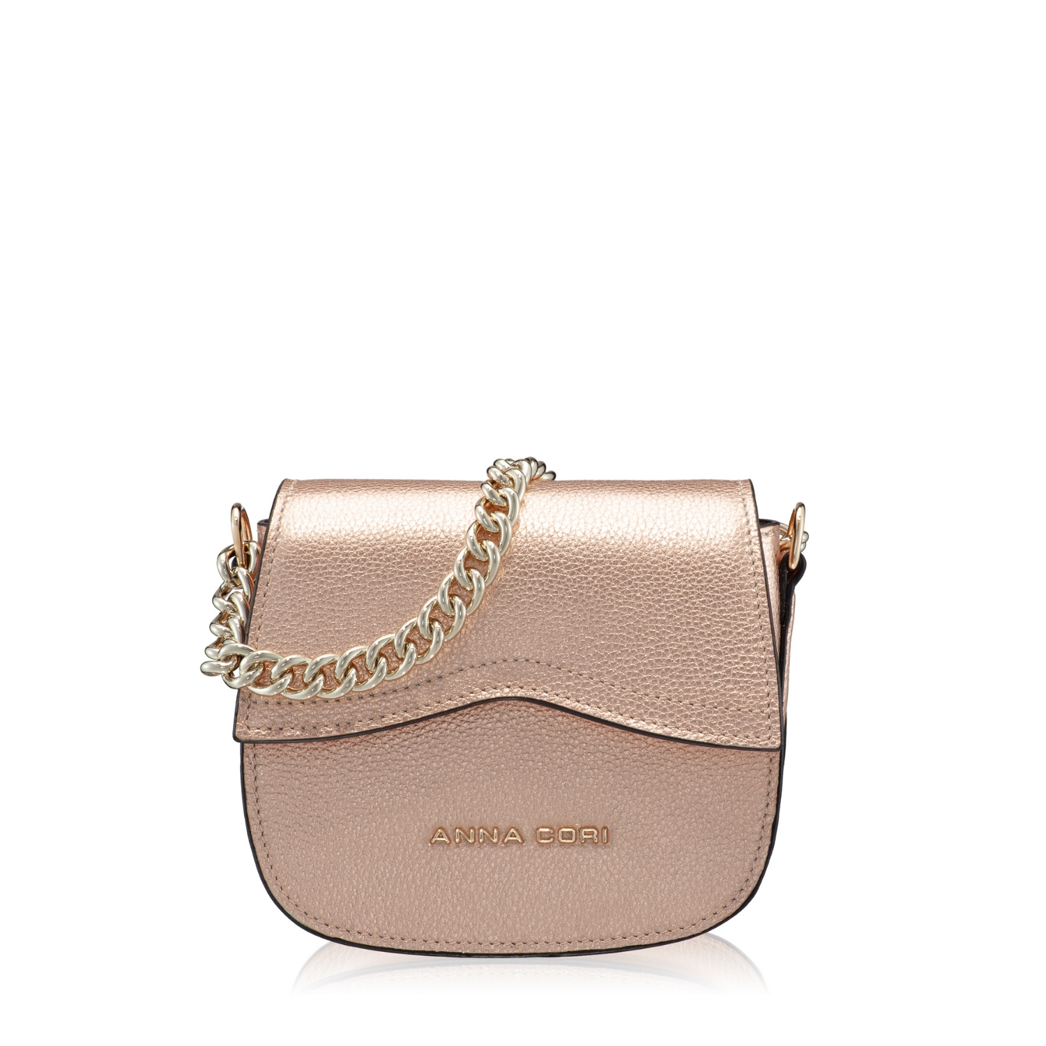Mini geanta #NEVADA este realizată din piele naturală de vițel, cu o textură fină și accesorizată cu logo-ul Anna Cori. Este prevăzută cu lanț metalic auriu și poate fi purtată crossbody datorită baretei din piele naturală.