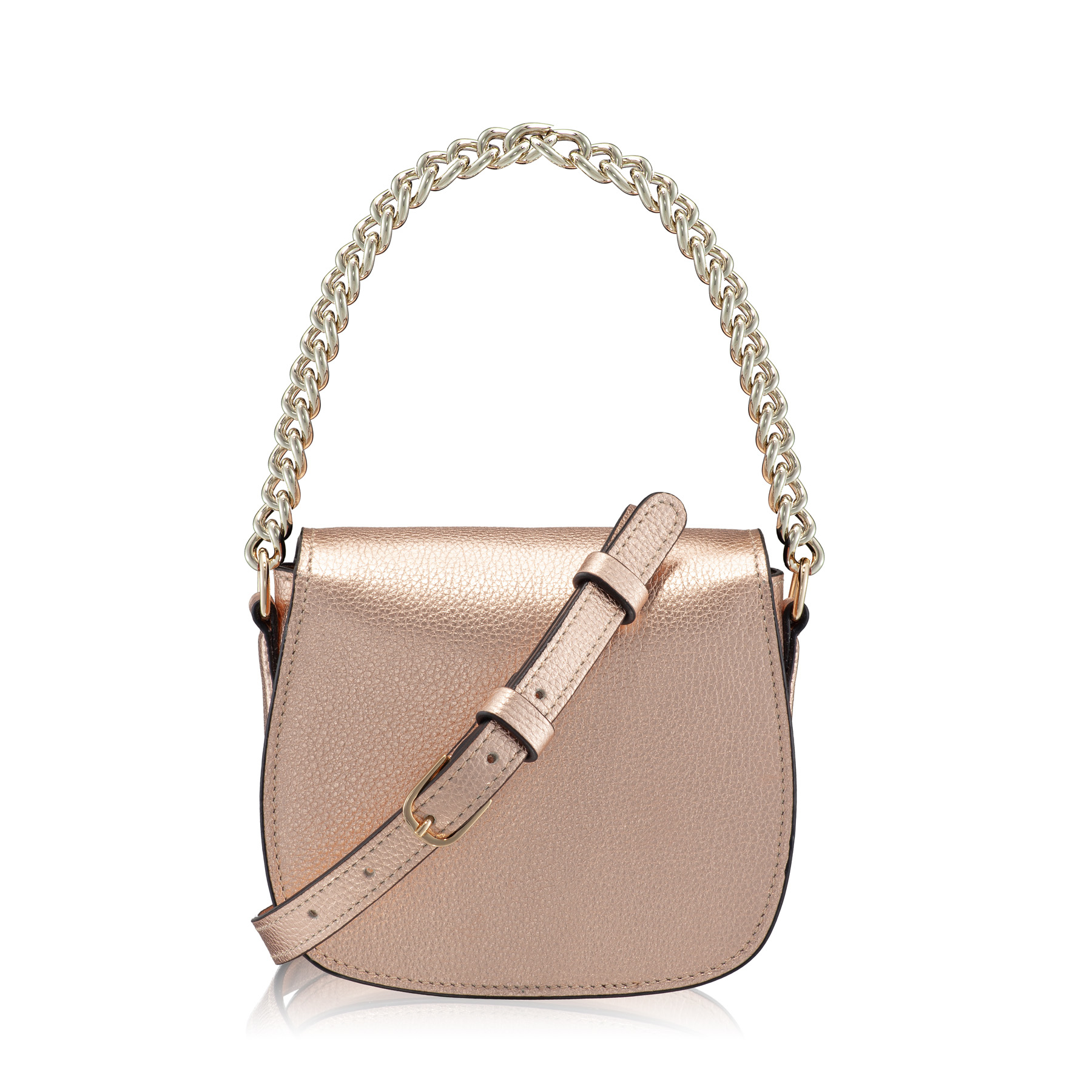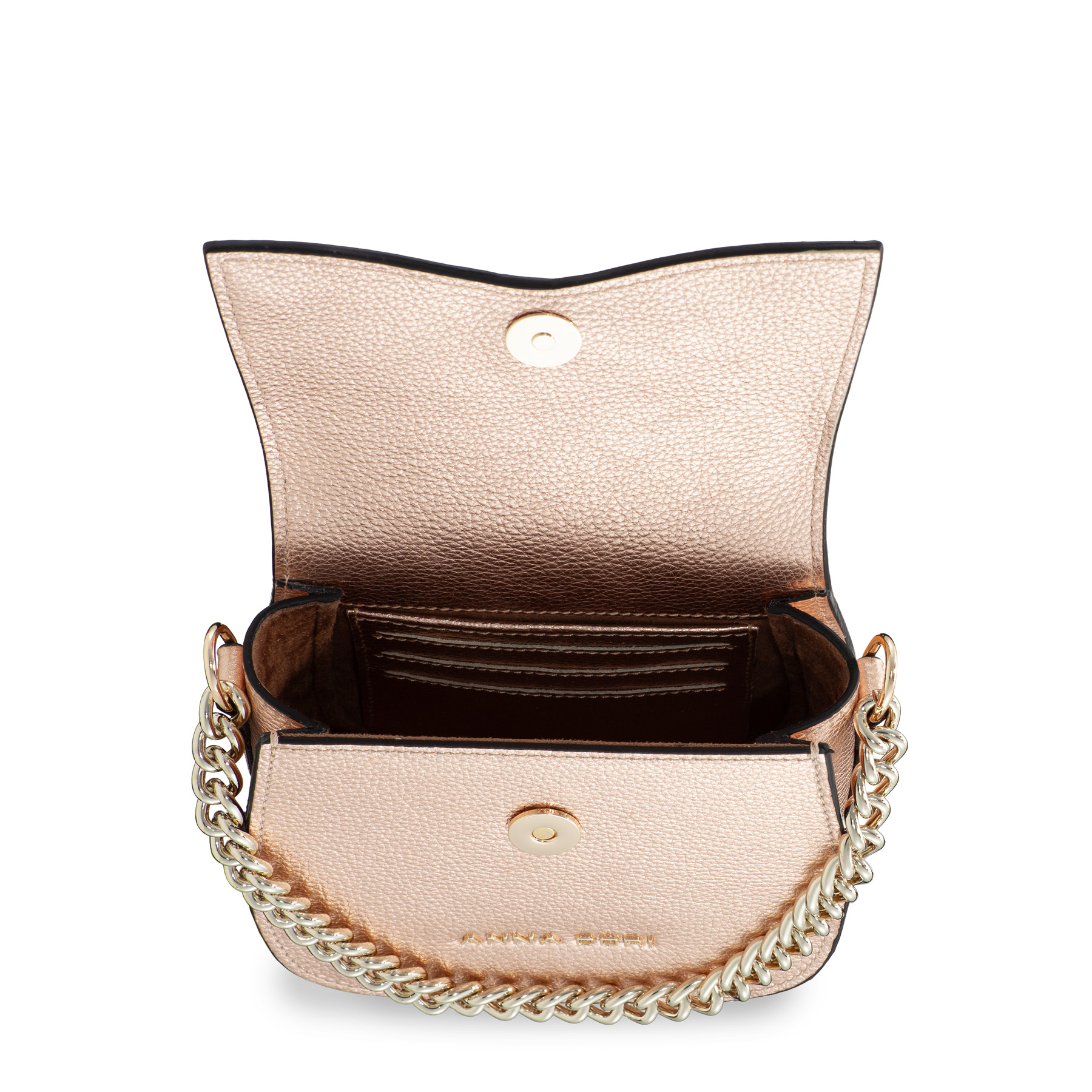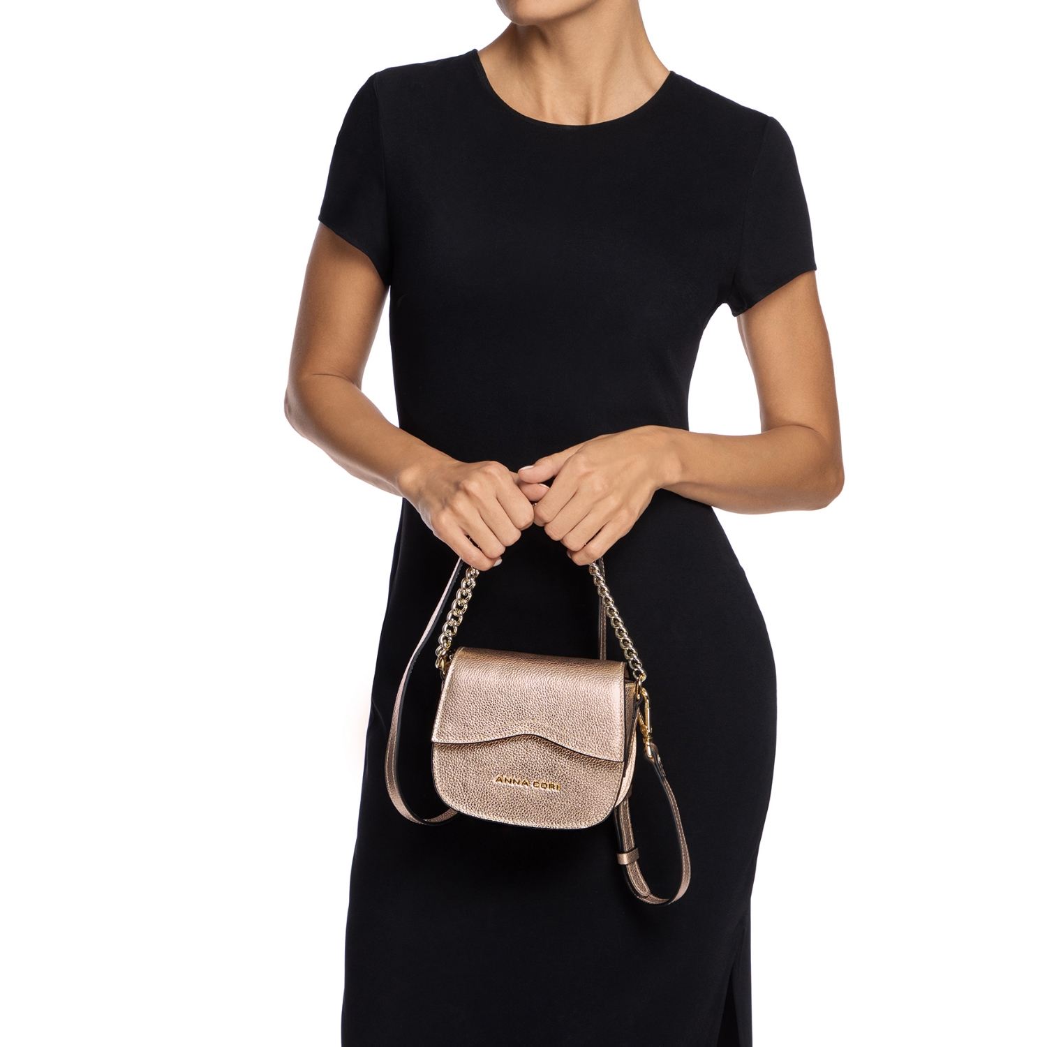 Mini geanta #NEVADA este realizată din piele naturală de vițel, cu o textură fină și accesorizată cu logo-ul Anna Cori. Este prevăzută cu lanț metalic auriu și poate fi purtată crossbody datorită baretei din piele naturală.
