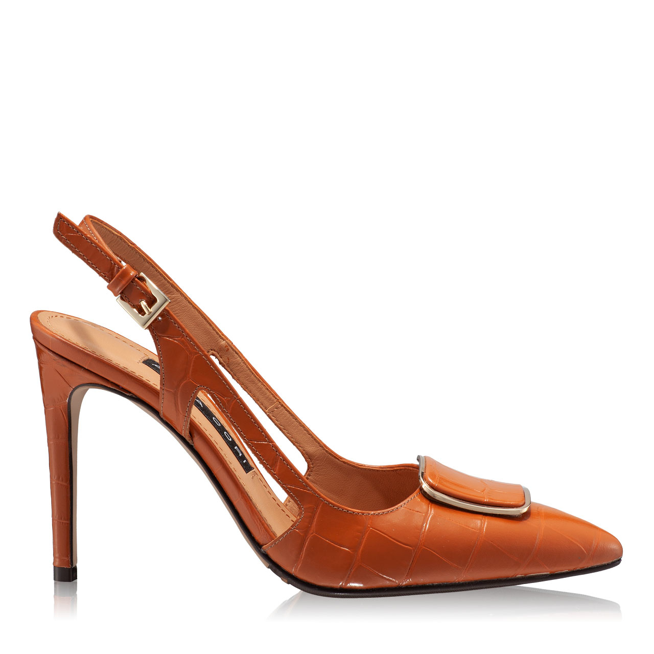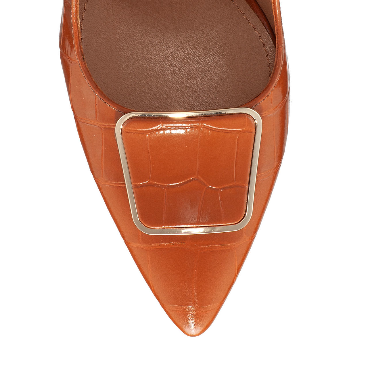 Pantofi damă decupați, din piele naturală croco.Sunt prevăzuți cu accesoriu frontal.Dimensiunea tocului este de 95 mm și se închid cu cataramă laterală.Sunt căptușiți cu piele naturală și accesoriile sunt de culoare aurie.