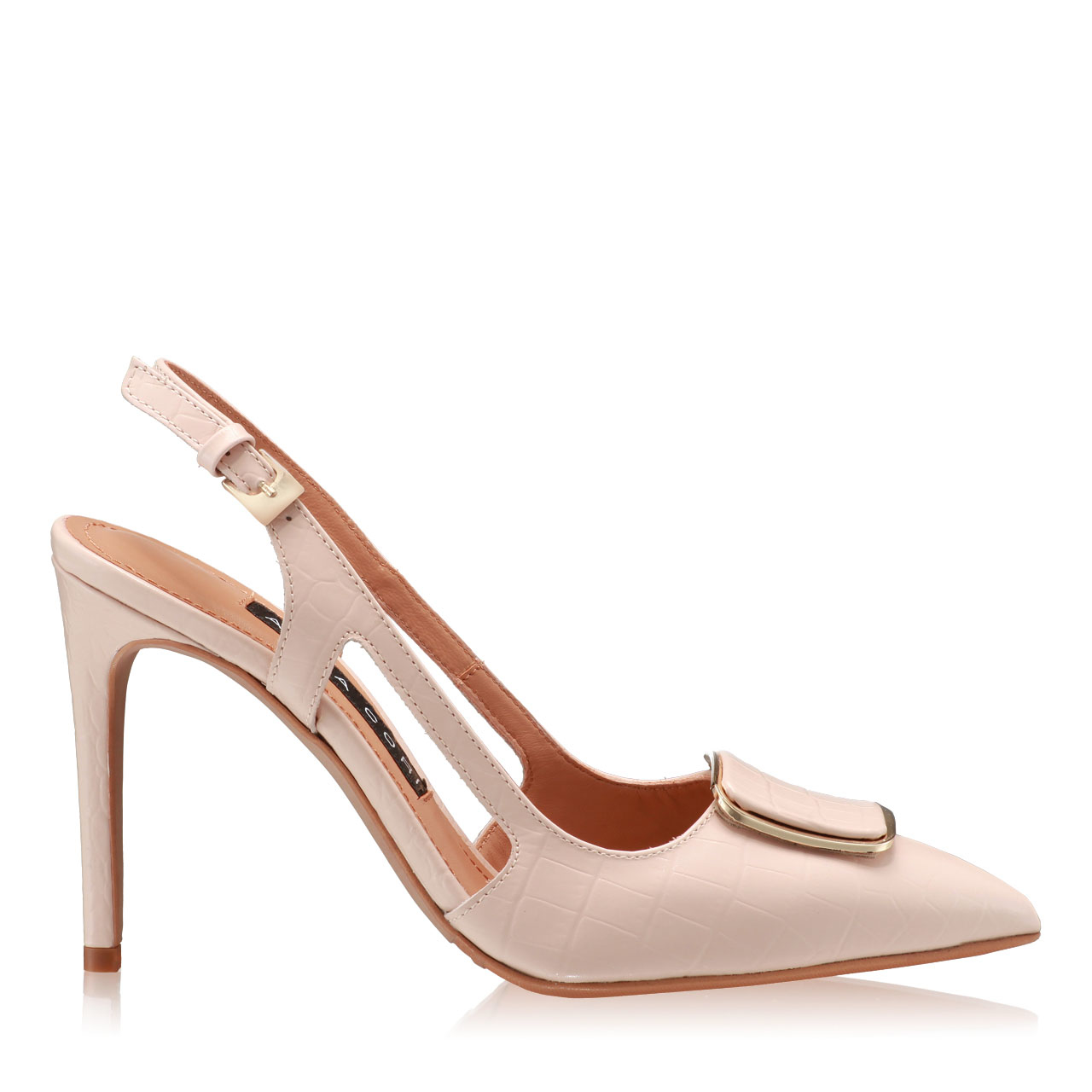Pantofi eleganti dama din piele naturala croco, cu accesoriu auriu. Inchiderea se face prin catarama laterala, iar inaltimea tocului este de 95mm.