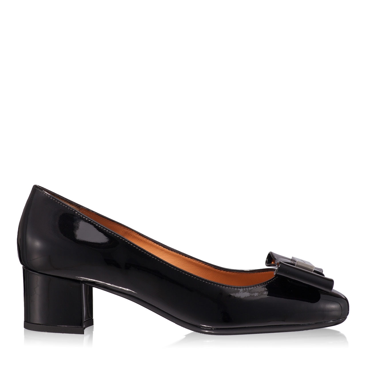 Pantofi eleganti dama din piele lacuita, cu detaliu fundita si accesoriu personalizat.