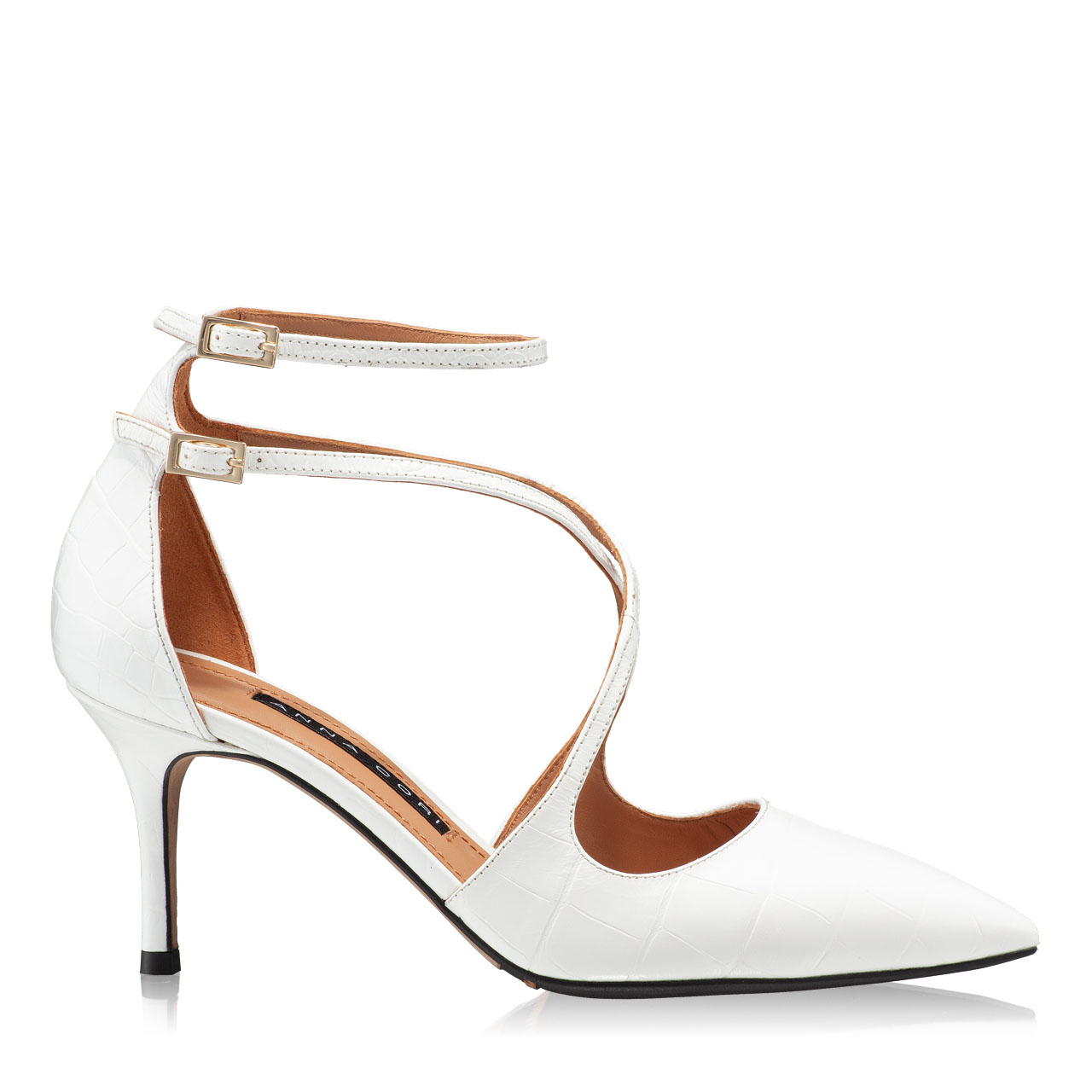 Pantofi eleganți de damă, din piele naturală croco, prevăzuți cu barete transversale.Sunt căptușiți cu piele naturală și se închid cu catarame laterale de culoare aurie.Înălțimea tocului este de 75 mm.