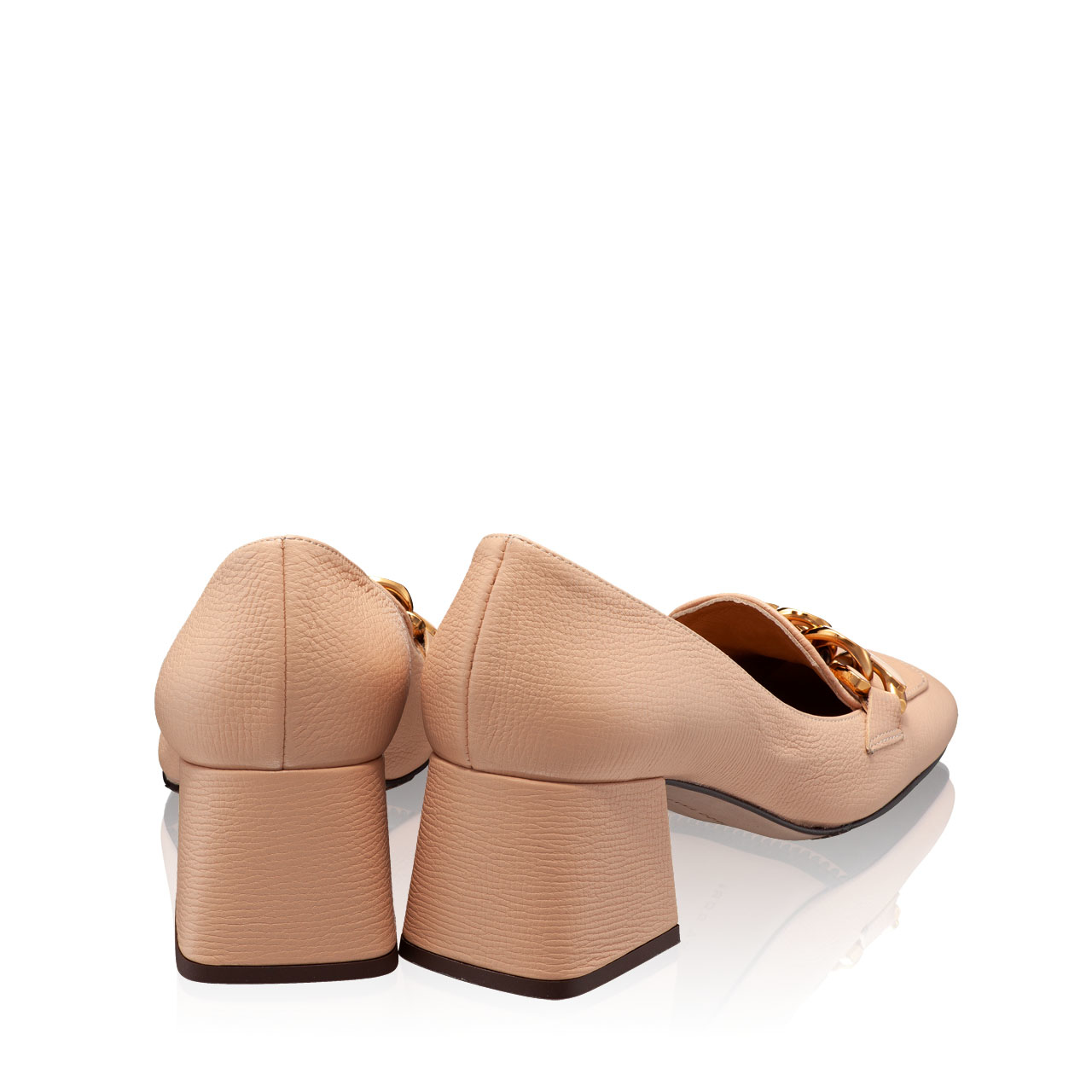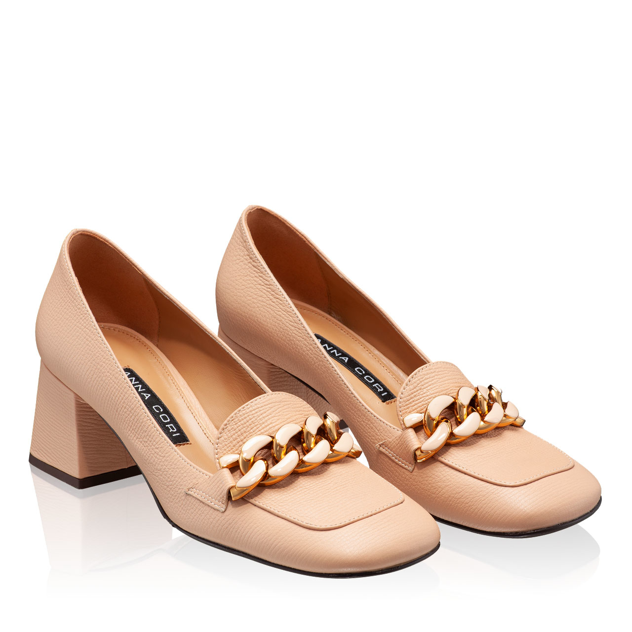 Clasici prin simplitatea lor, pantofii #LUCINDA sunt confecționați din piele naturală de vițel și accesorizați cu lanț metalic auriu. Se caracterizează printr-un toc ușor de purtat, într-o formă pătrată, cu o înălțime medie de 55 mm.