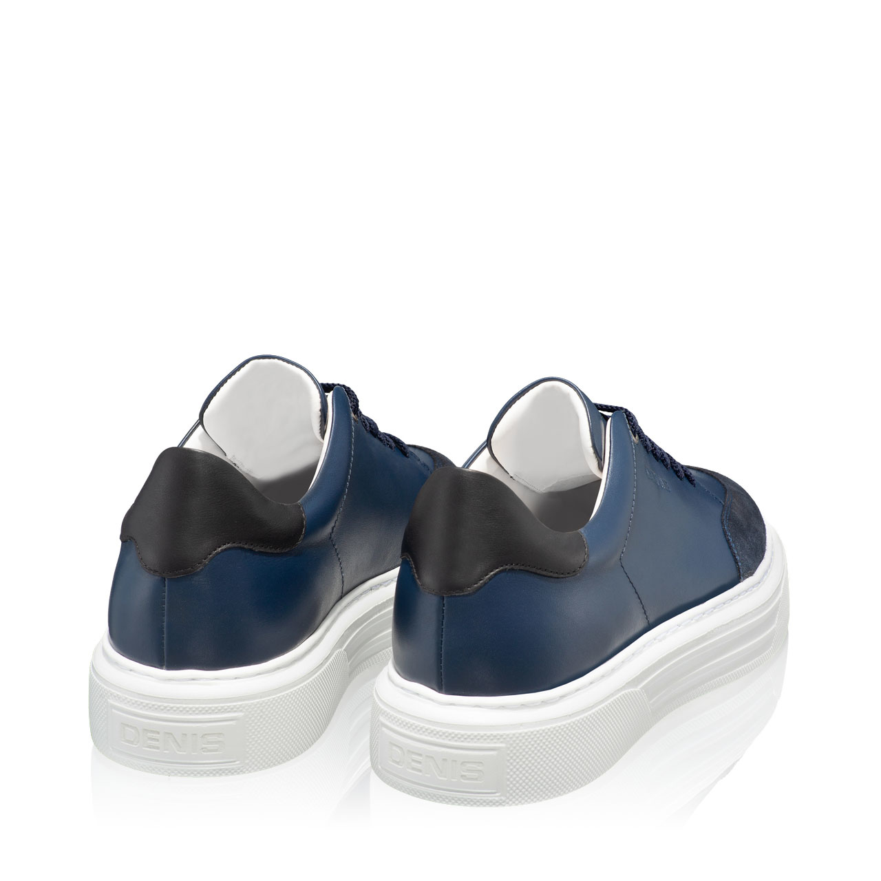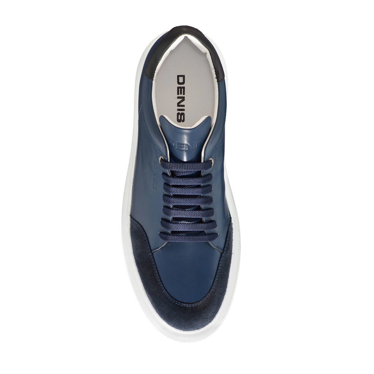 Pantofi sport bărbați din piele naturală, personalizați cu logo-ul Denis.Prevăzuți cu detalii din piele naturală de culoare neagră și piele întoarsă de culoare albastră.Sunt căptușiți cu piele naturală, iar închiderea se face cu șiret.