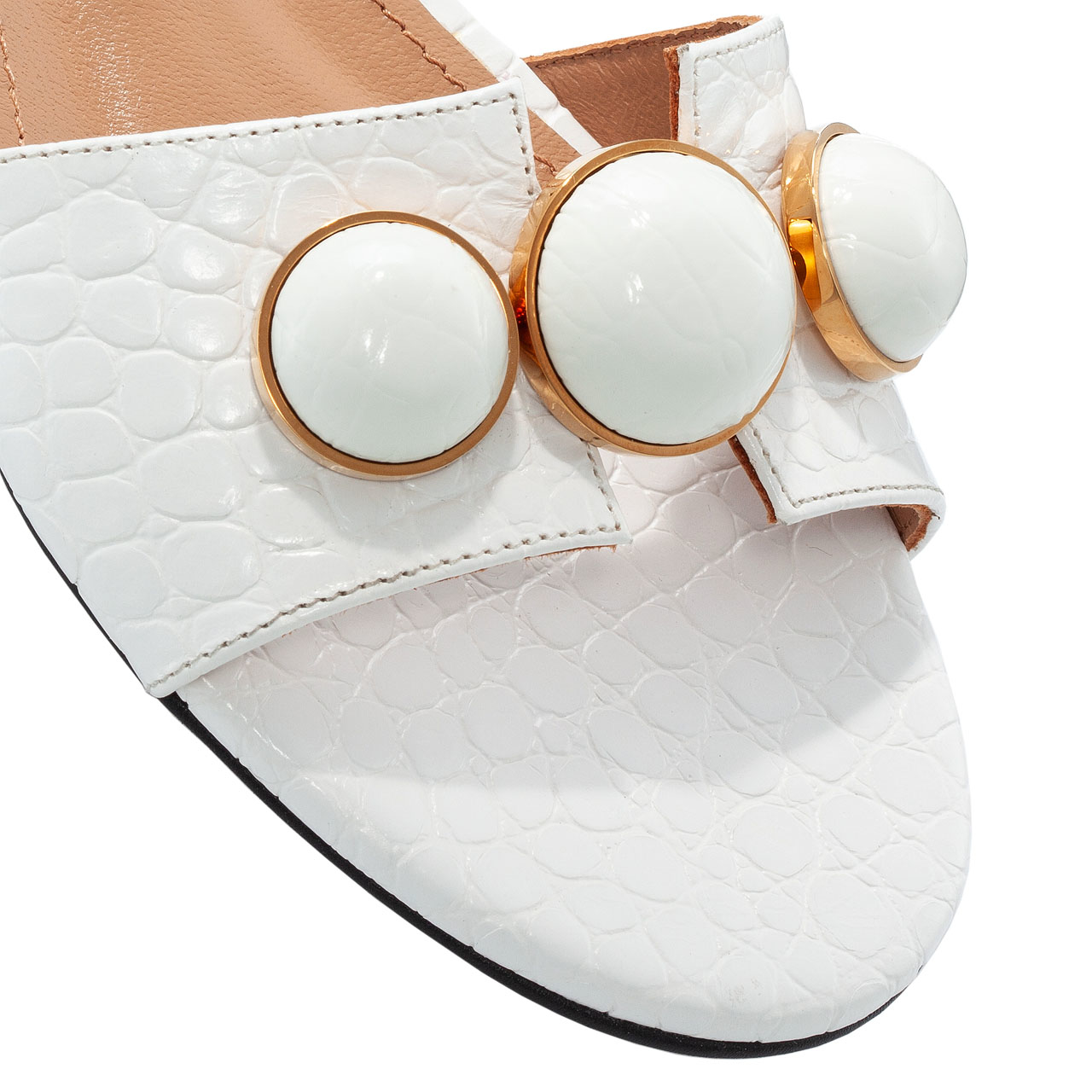 Papuci dama din piele naturala cu imprimeu pytone, prevazuti cu accesorii aurii.Sunt captusiti cu piele naturala si inaltimea tocului este de 15 mm.