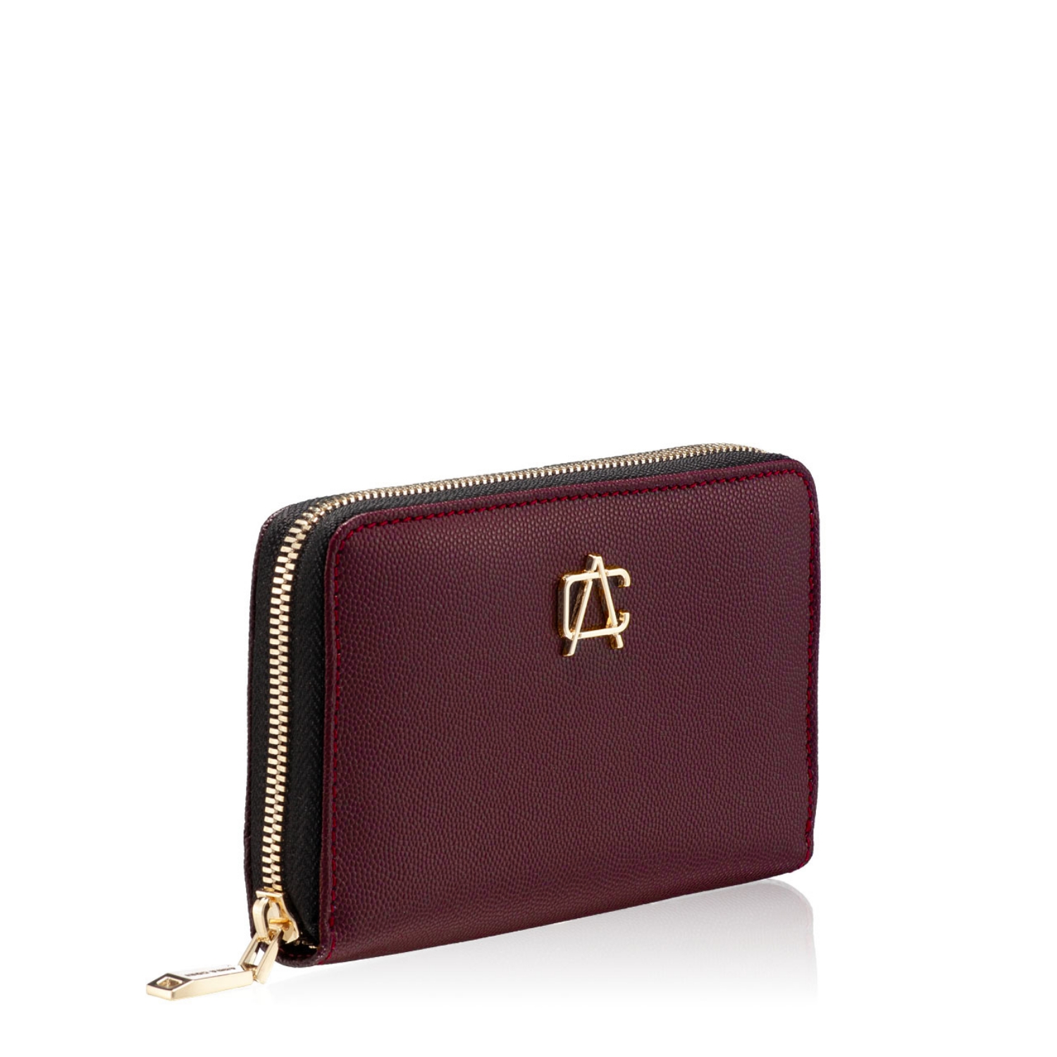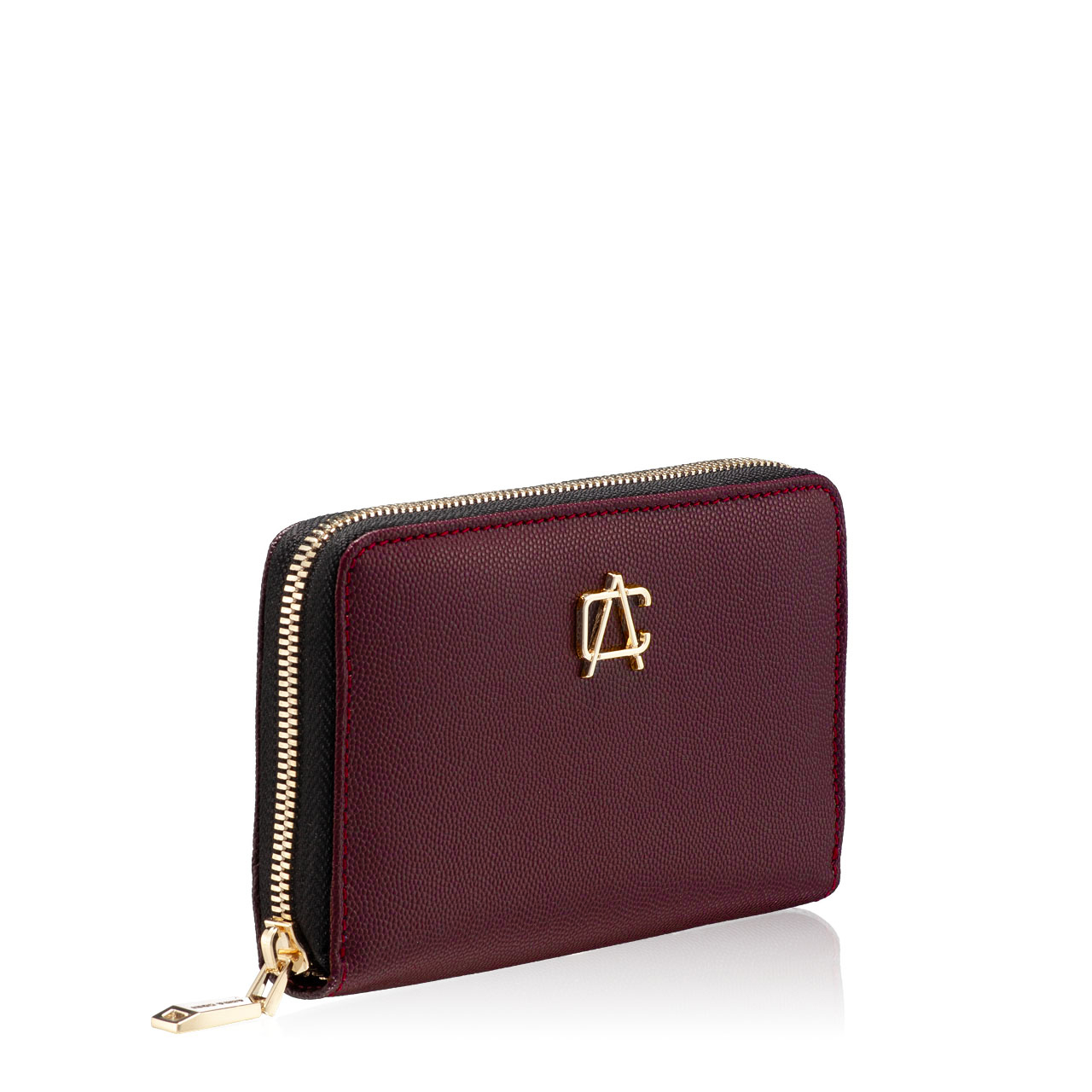 Portofel dama din piele naturala stampata, personalizat cu monograma ANNA CORI. Este prevazut cu 3 compartimente, un buzunar cu fermoar pentru monede si 8 spatii pentru depozitare carduri.
