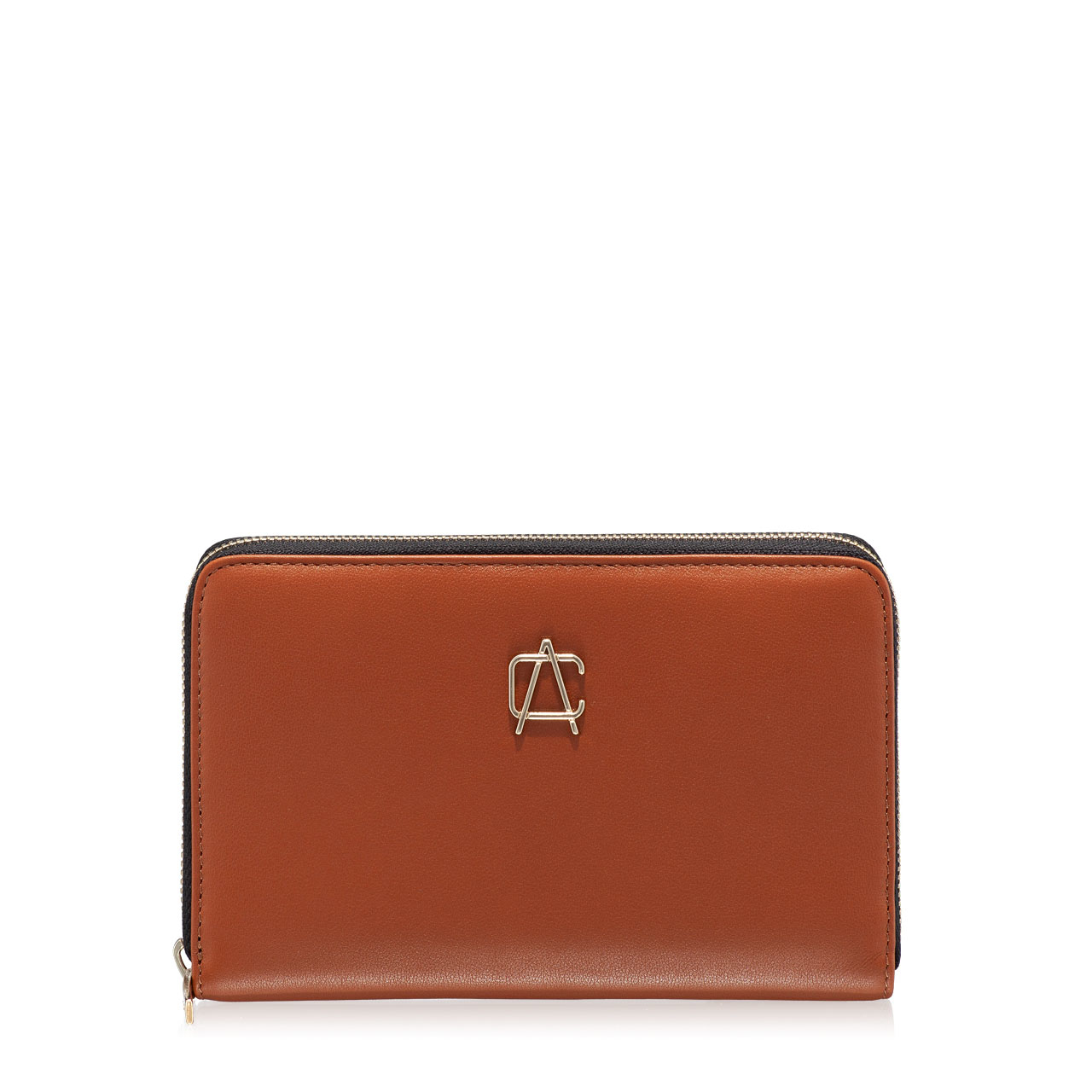 Portofel dama din piele naturala, personalizat cu monograma ANNA CORI. Este prevazut cu 3 compartimente, un buzunar cu fermoar pentru monede si 8 spatii pentru carduri.