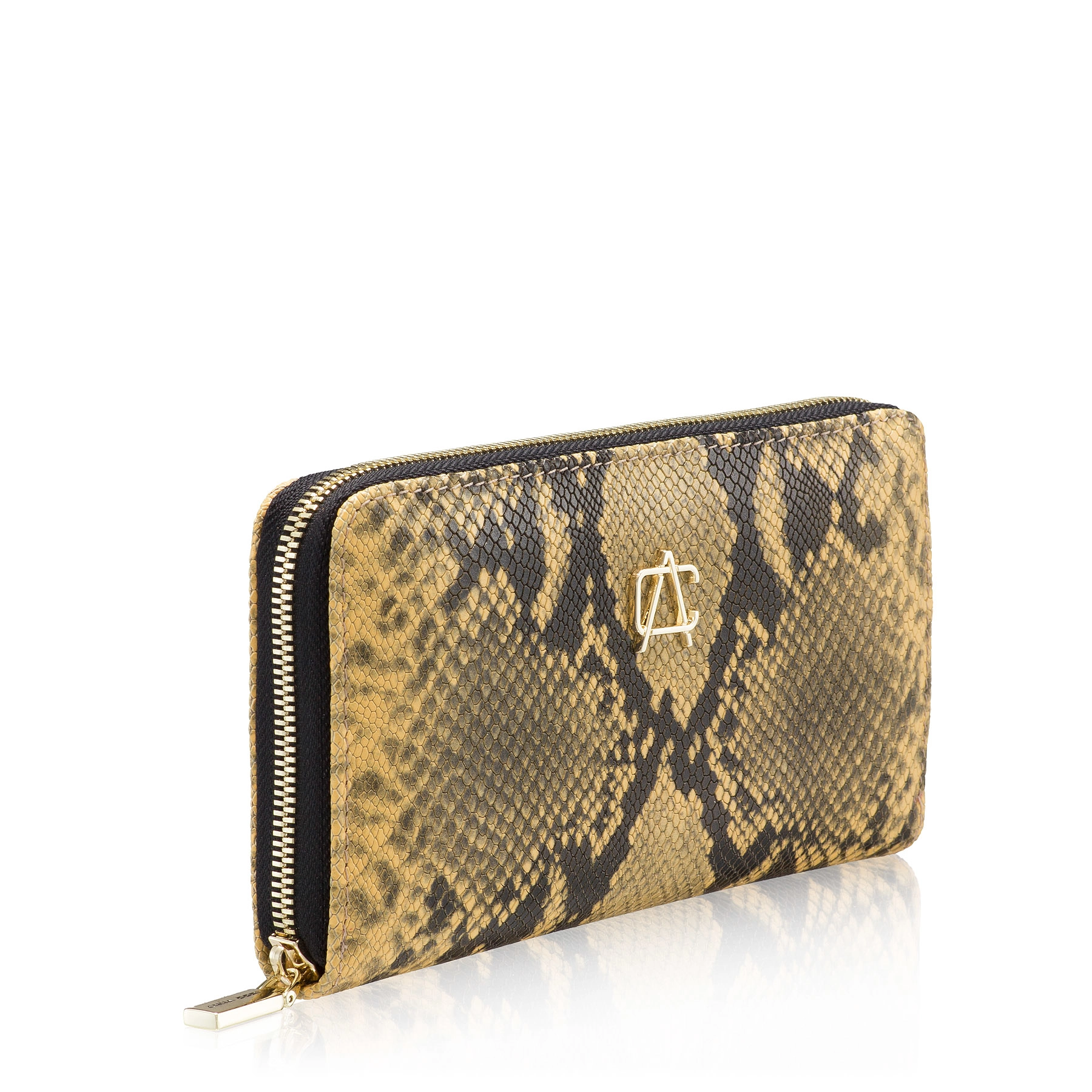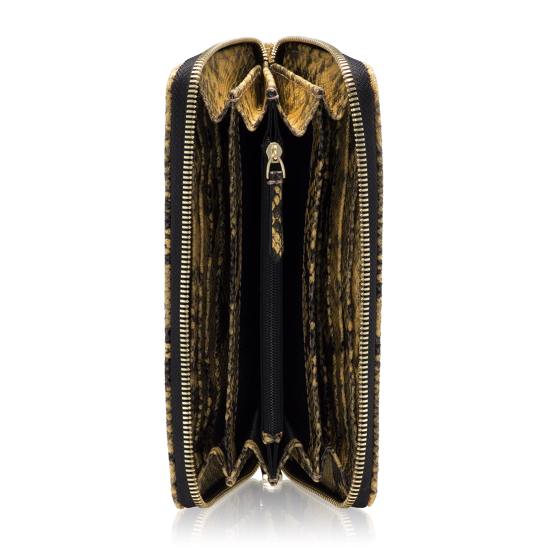 Portofel dama din piele naturala cu imprimeu pitone, prevazut cu 4 compartimente, un buzunar cu fermoar pentru monede si 8 spatii pentru carduri.Inchiderea se face cu fermoar.