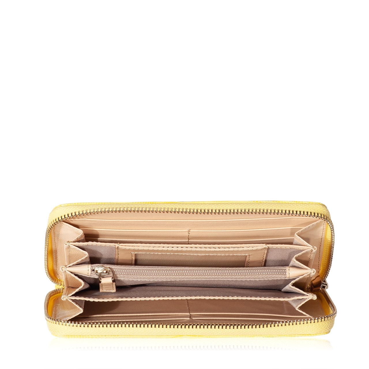 Portofel dama din piele stampata. Este prevazut cu 4 compartimente pentru depozitare bani, un buzunar cu fermoar pentru monede si 8 spatii pentru carduri.Inchiderea se face cu fermoar.