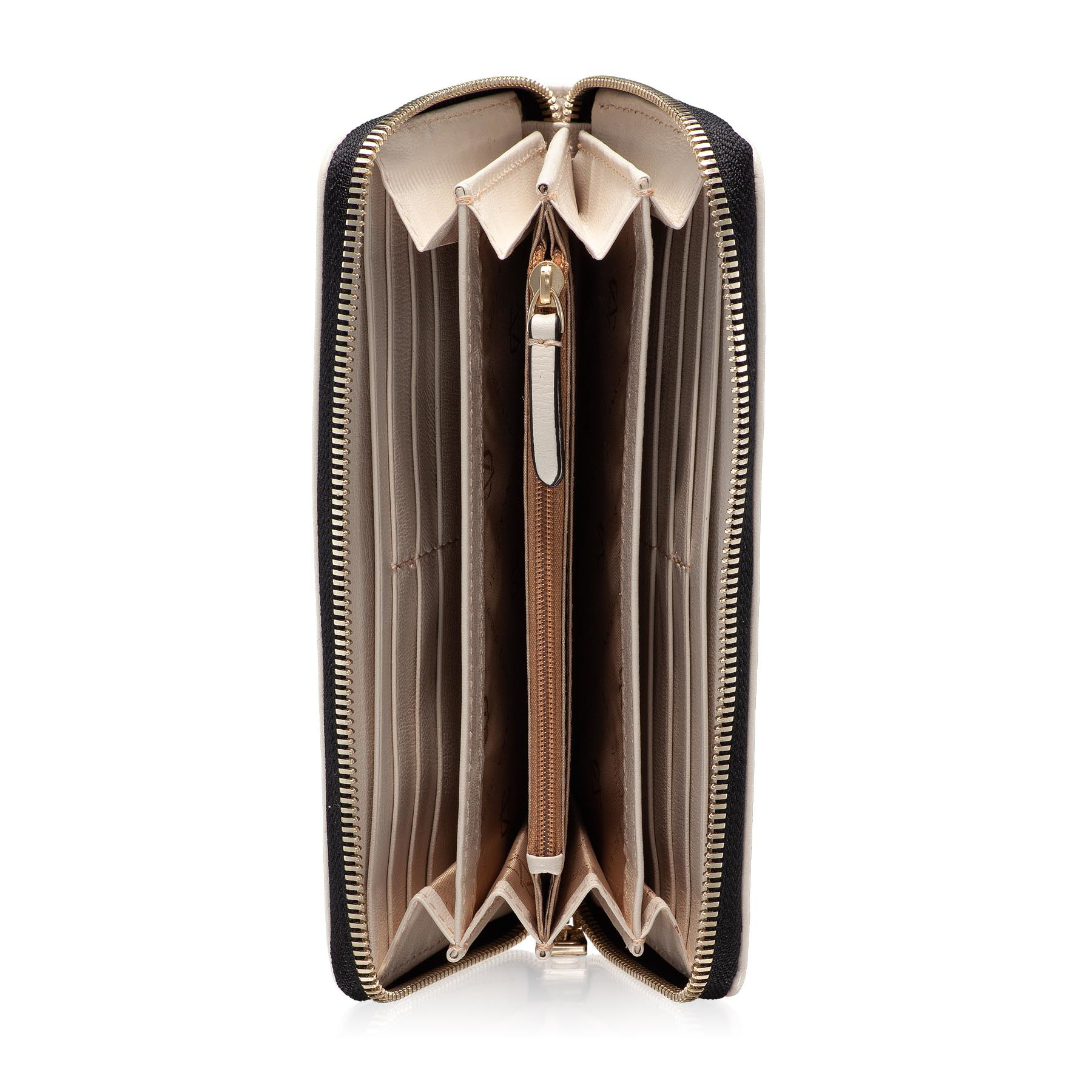 Este prevazut cu 4 compartimente, un buzunar cu fermoar pentru monede si 8 spatii pentru depozitare carduri.