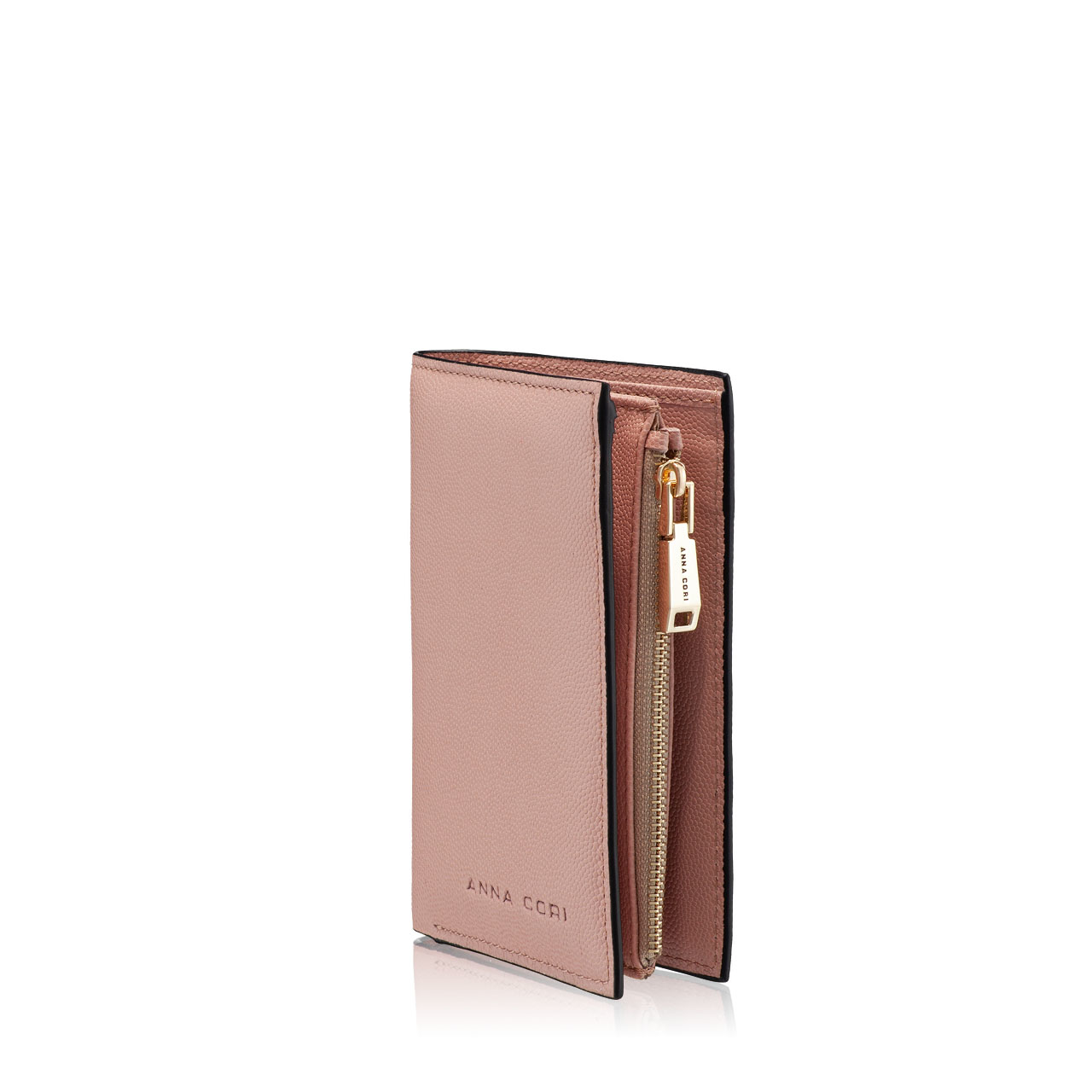 Portofel dama din piele naturala stampata, personalizat cu logo-ul ANNA CORI. Este prevazut cu un compartiment, un buzunar cu fermoar pentru monede si 8 spatii pentru depozitare carduri.