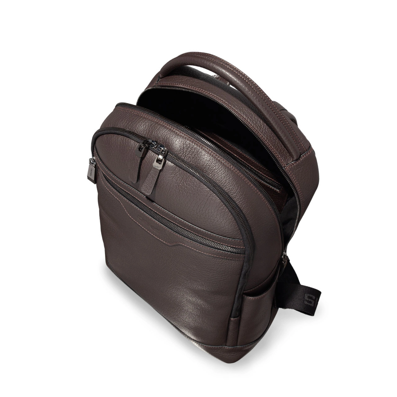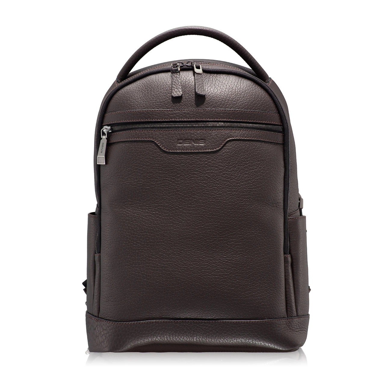 Rucsac barbati din piele naturala, personalizat cu logo-ul Denis stampat. Este prevazut cu maner si doua barete reglabile de umar. Contine cu doua compartimente, un buzunar interior si doua buzunare exterioare cu fermoar.