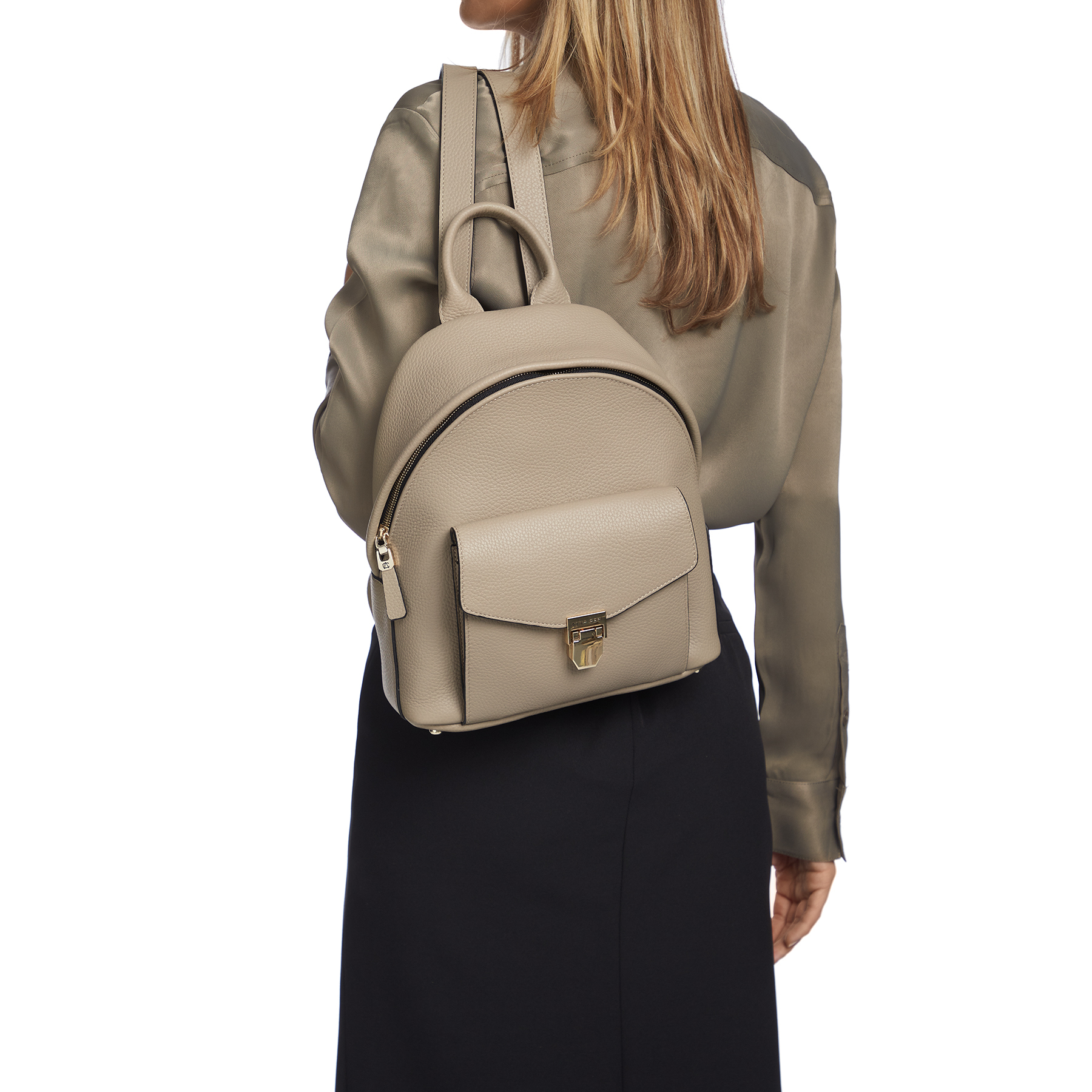 Rucsacul #IRA din piele naturală este prevăzut cu un buzunar frontal încăpător ce se închide cu cataramă metalică personalizată.