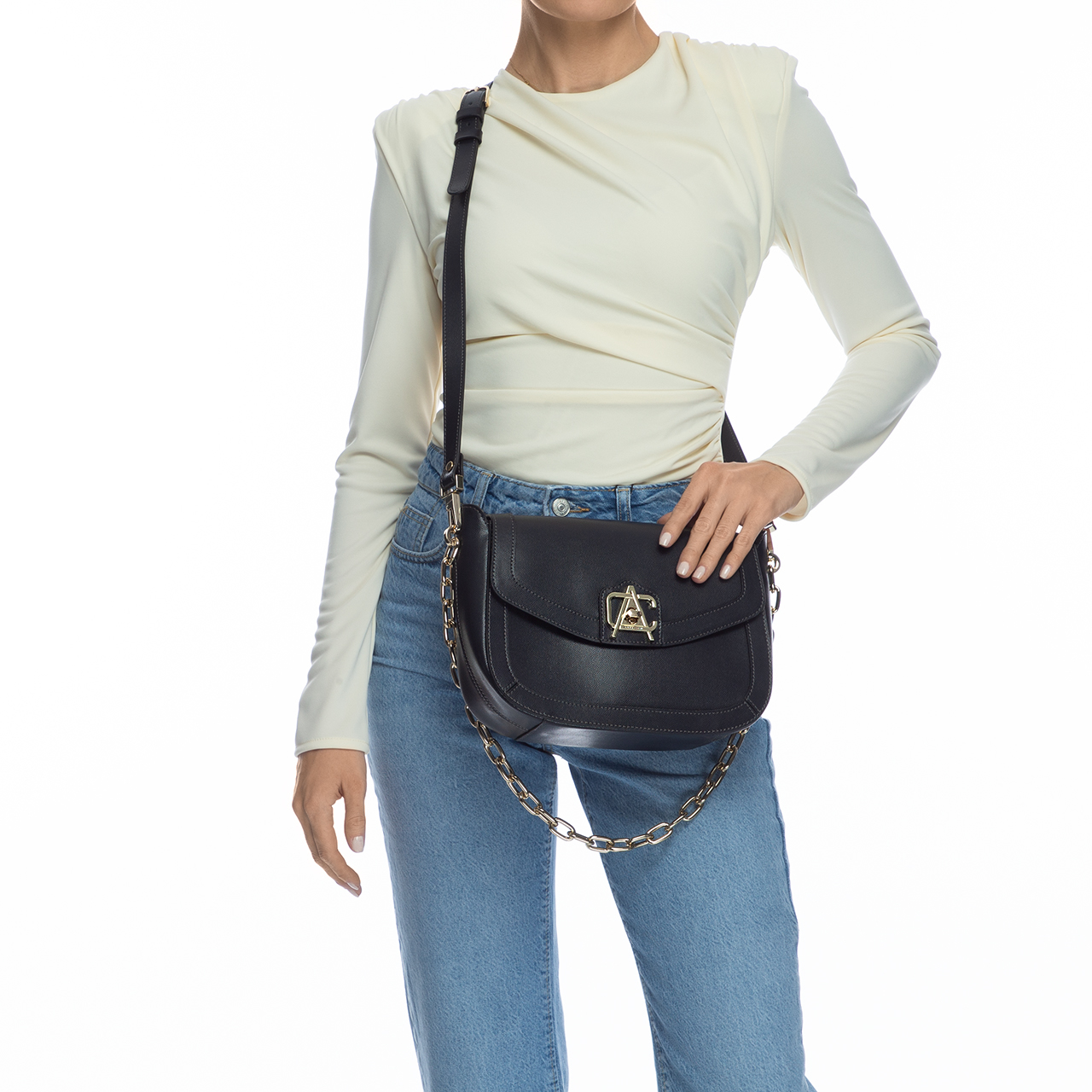 Inchiderea se face cu catarama, iar bareta de umar este reglabila si detasabila.