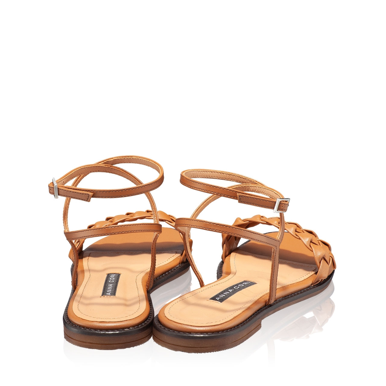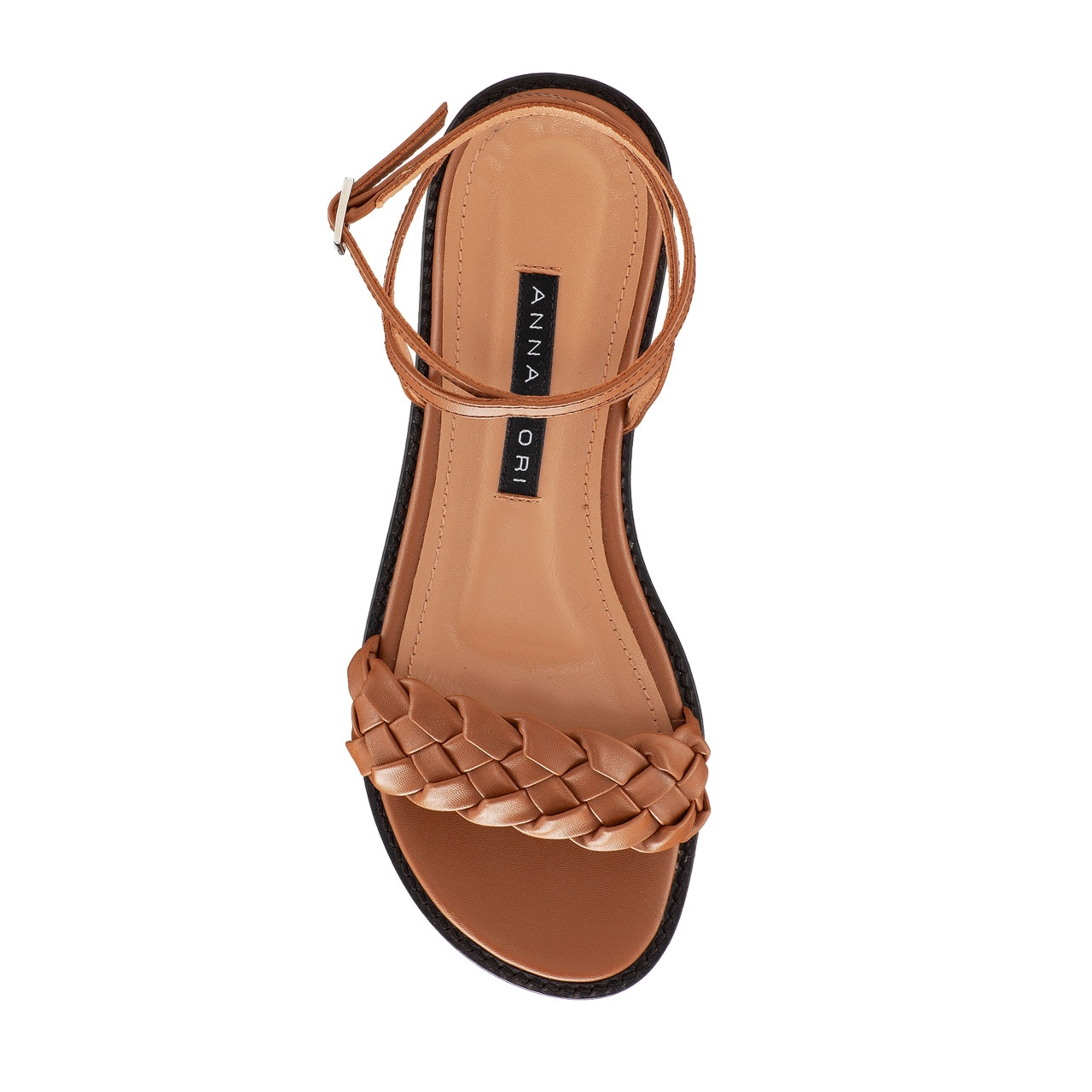 Sandale dama cu talpa joasa din piele ecologica, impletita manual. Inchiderea se face cu catarama laterala.