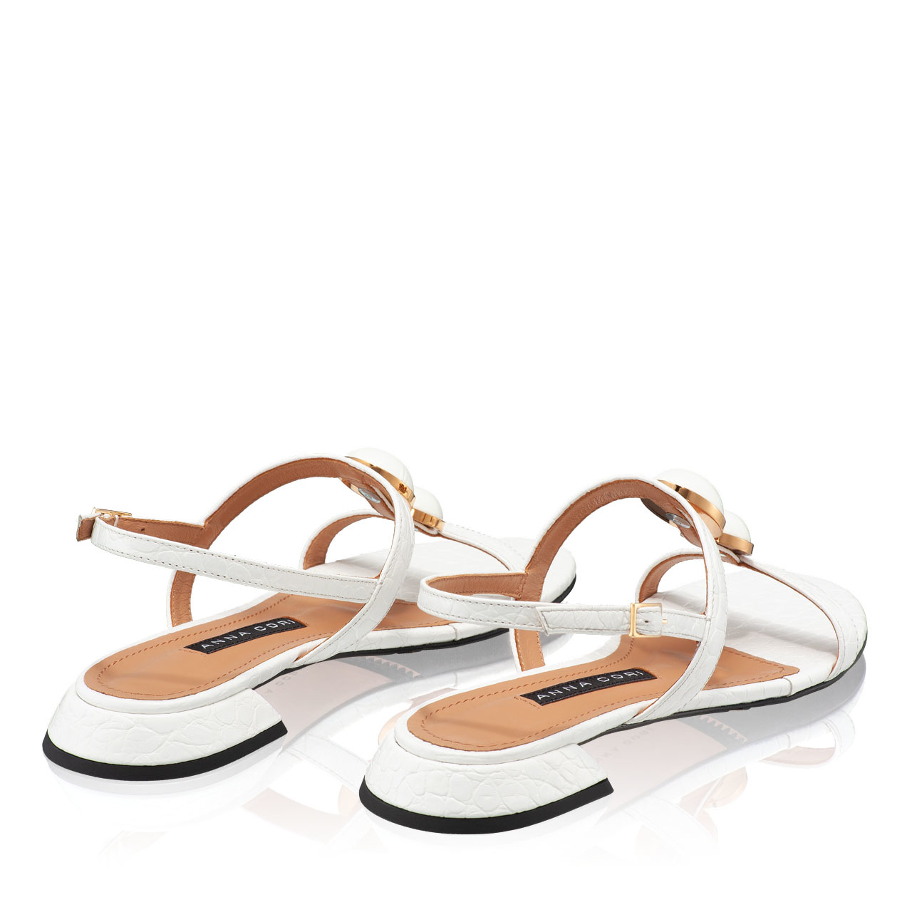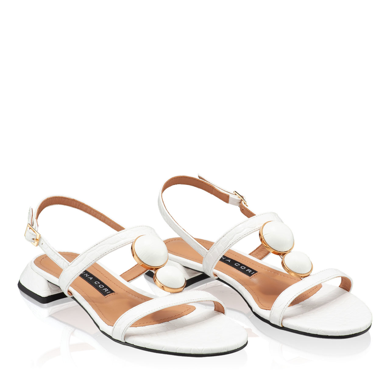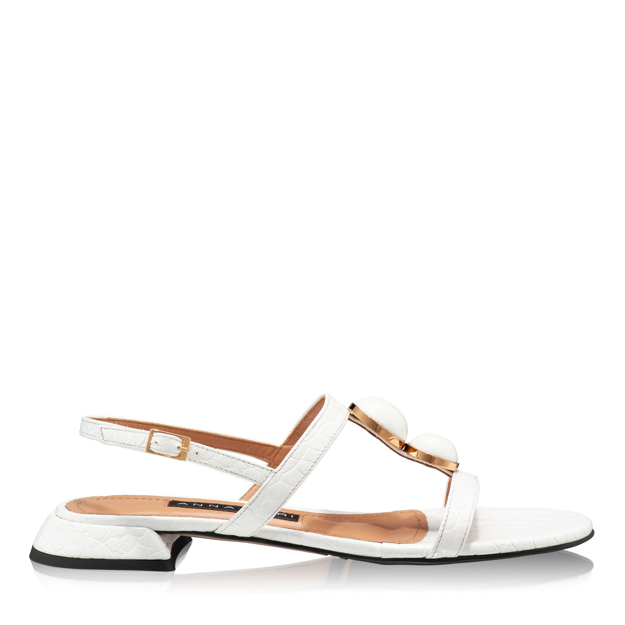 Sandale dama din piele naturala croco, prevazute cu accesorii aurii. Inchiderea se face cu catarama laterala.Sunt captusite cu piele naturala.Tocul este patrat si inaltimea lui este de 15 mm.