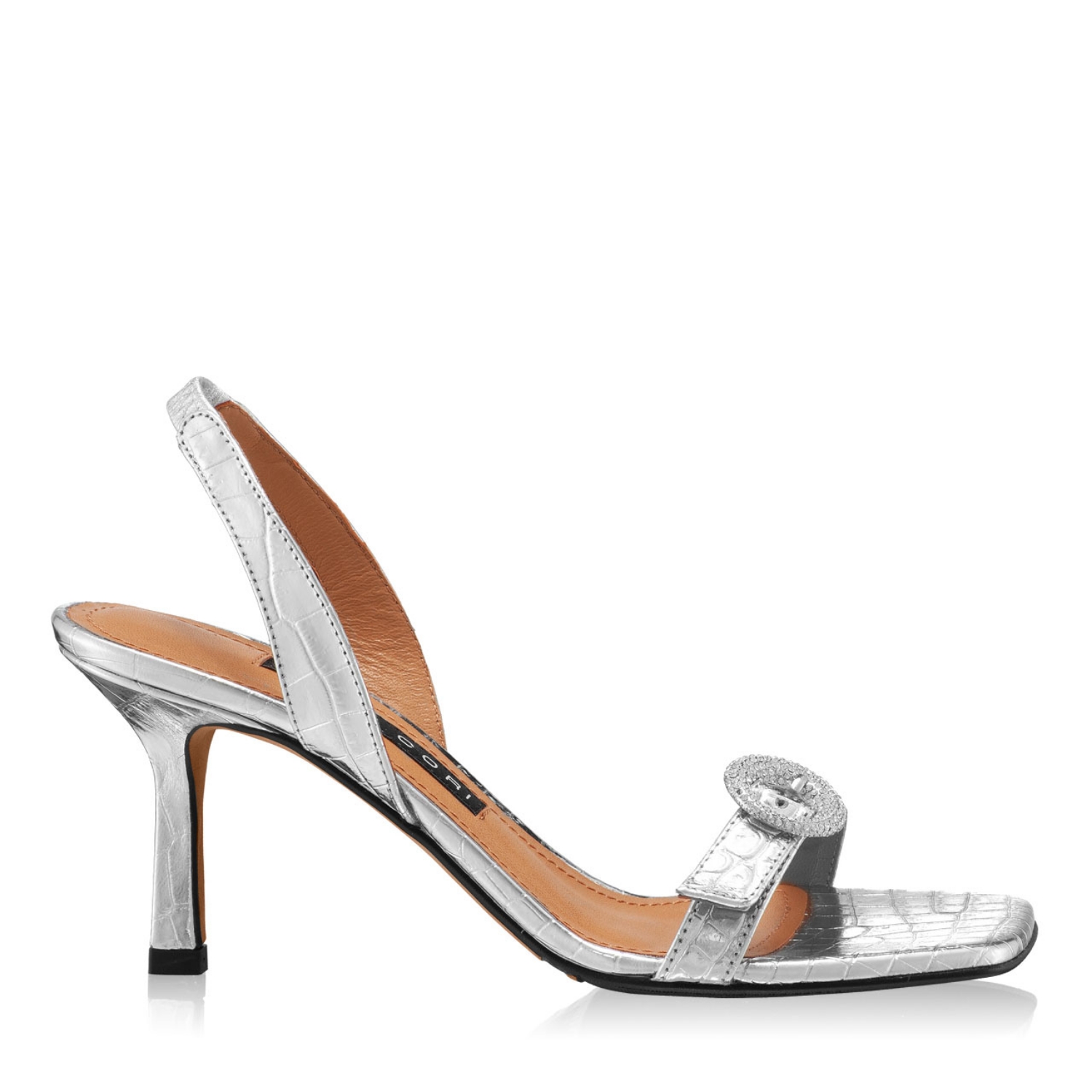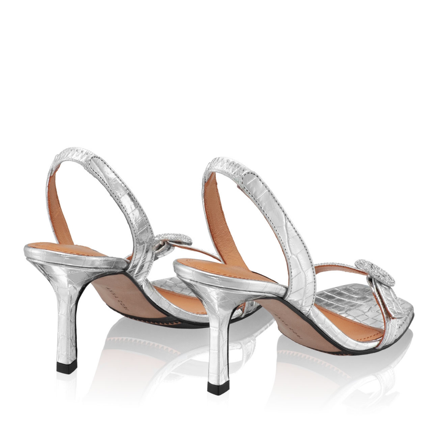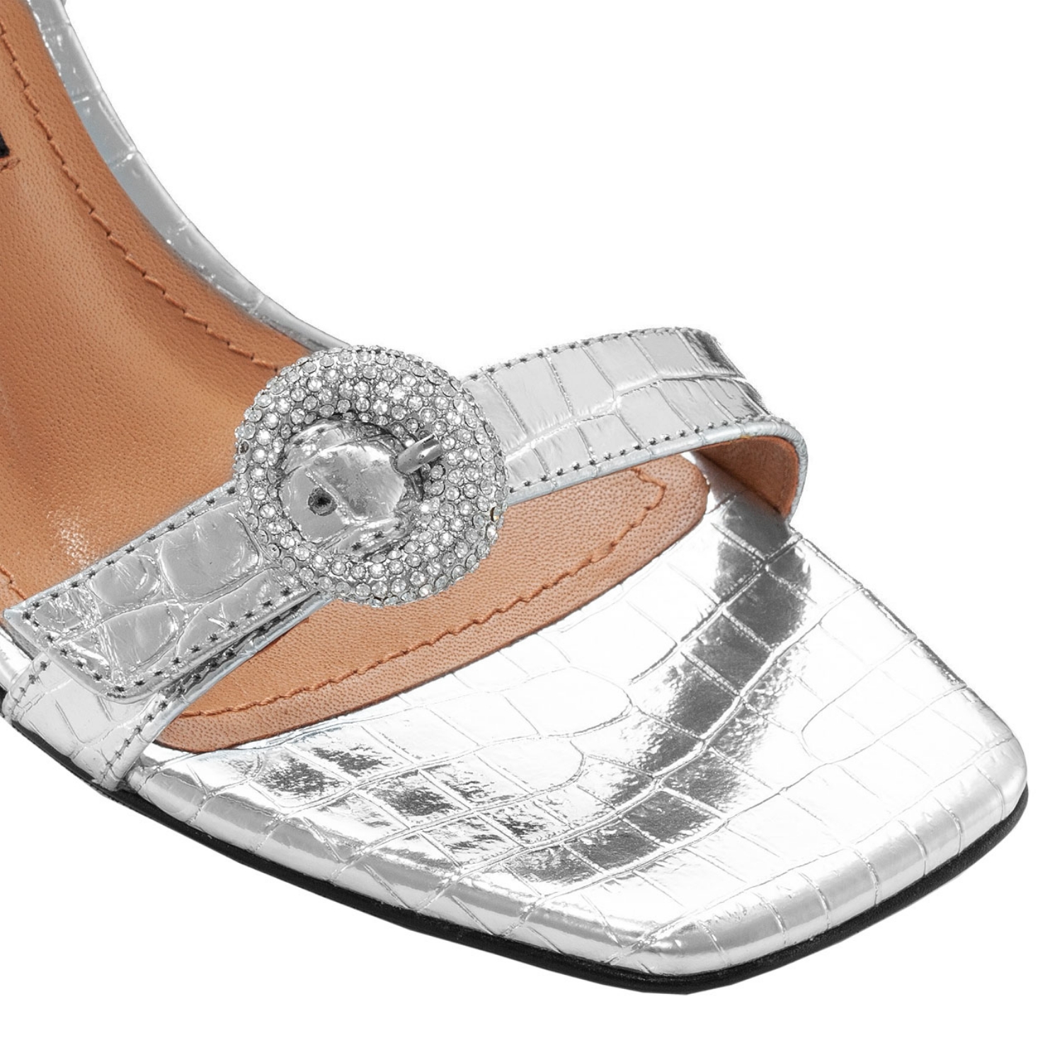 Sandale dama din piele naturala croco, prevazute cu bareta cu elastic.Personalizate cu accesoriu metalic stralucitor de culoare argintie.Inaltimea tocului este de 75mm.