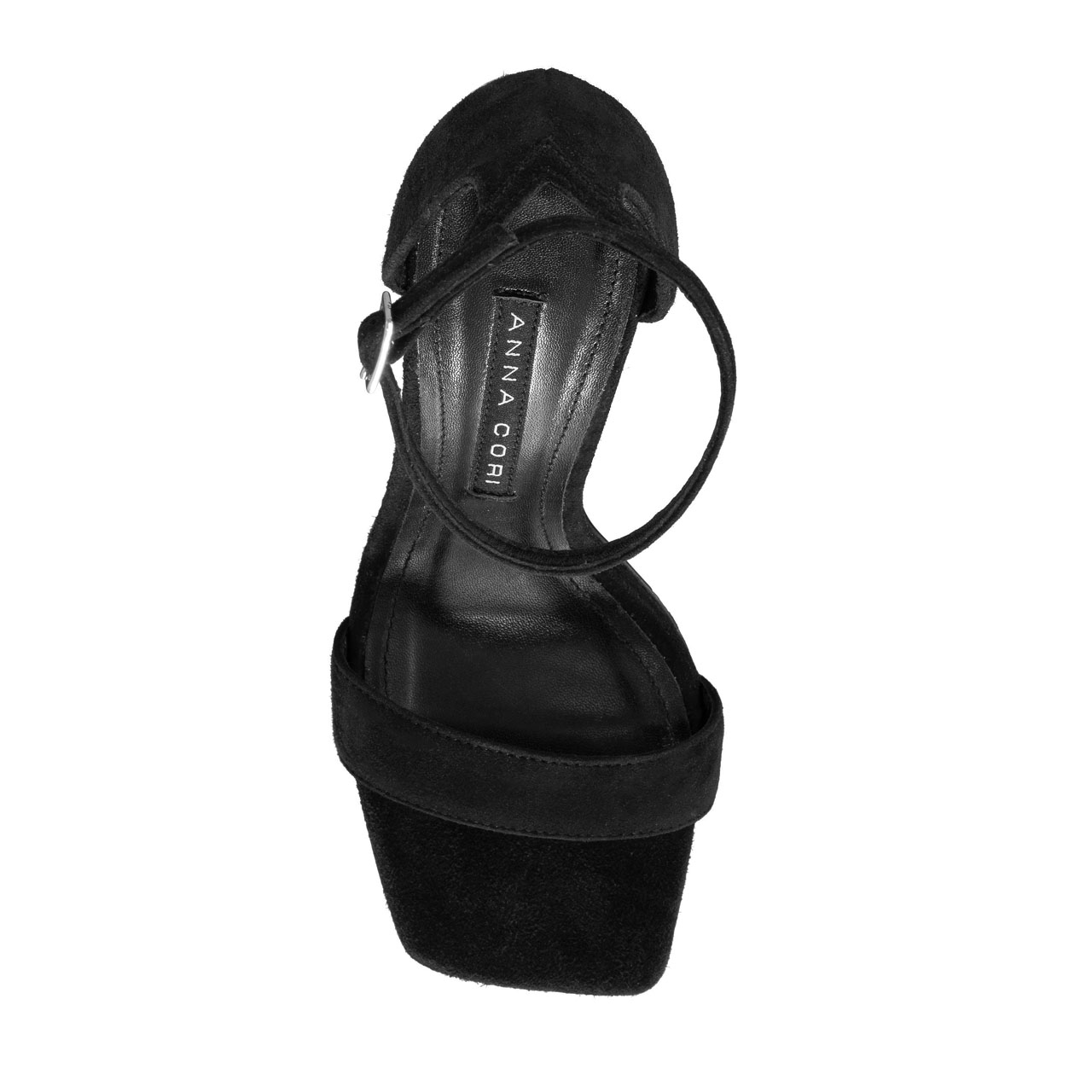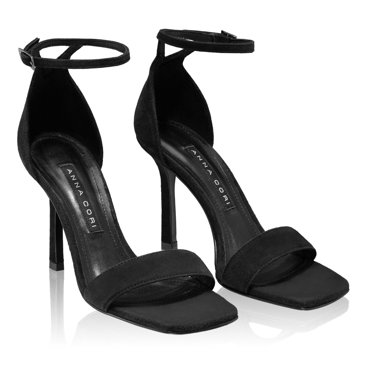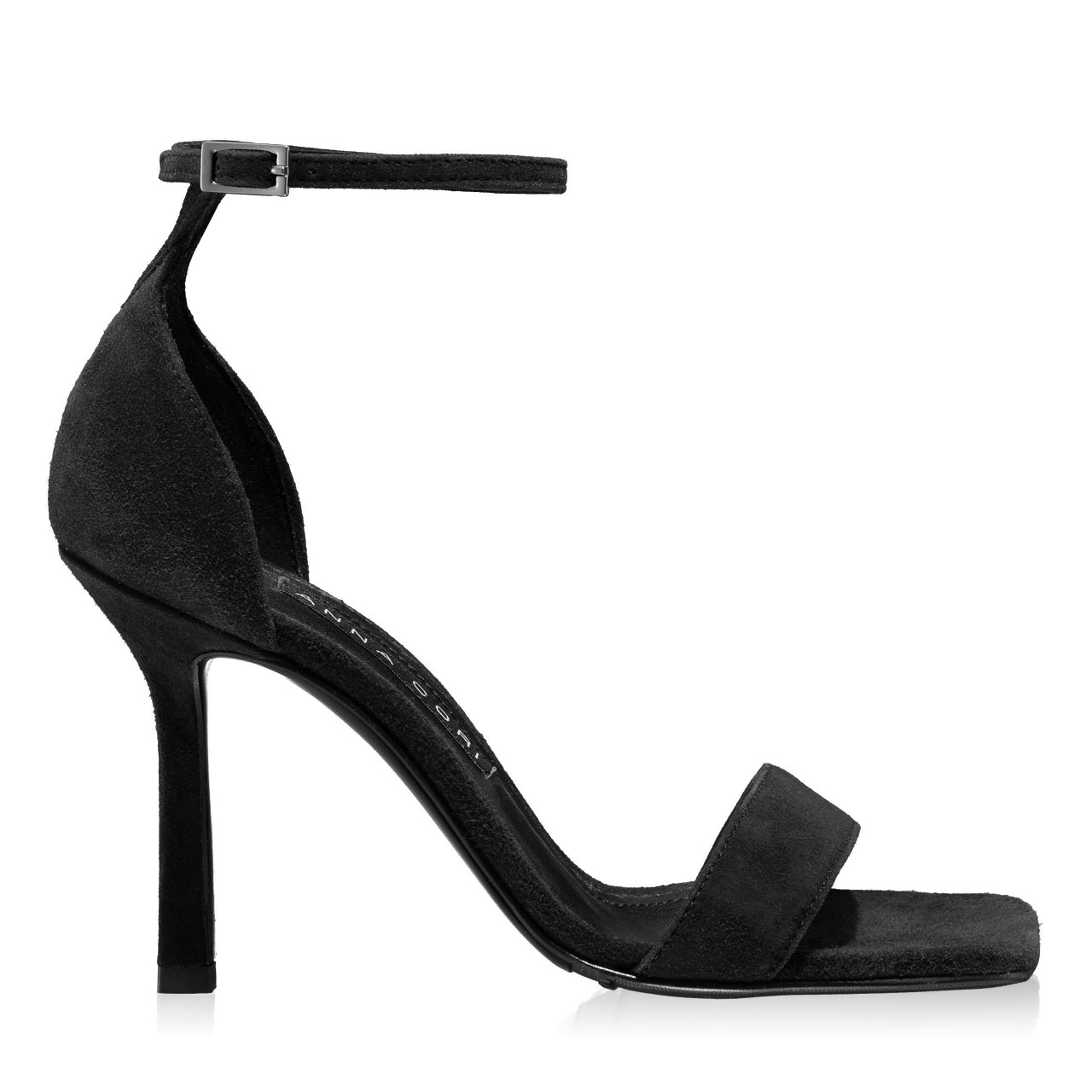 Sandale dama din piele naturala intoarsa, prevazute cu bareta la glezna.Inchiderea se face cu catarama argintie.Inaltimea tocului este de 95mm.