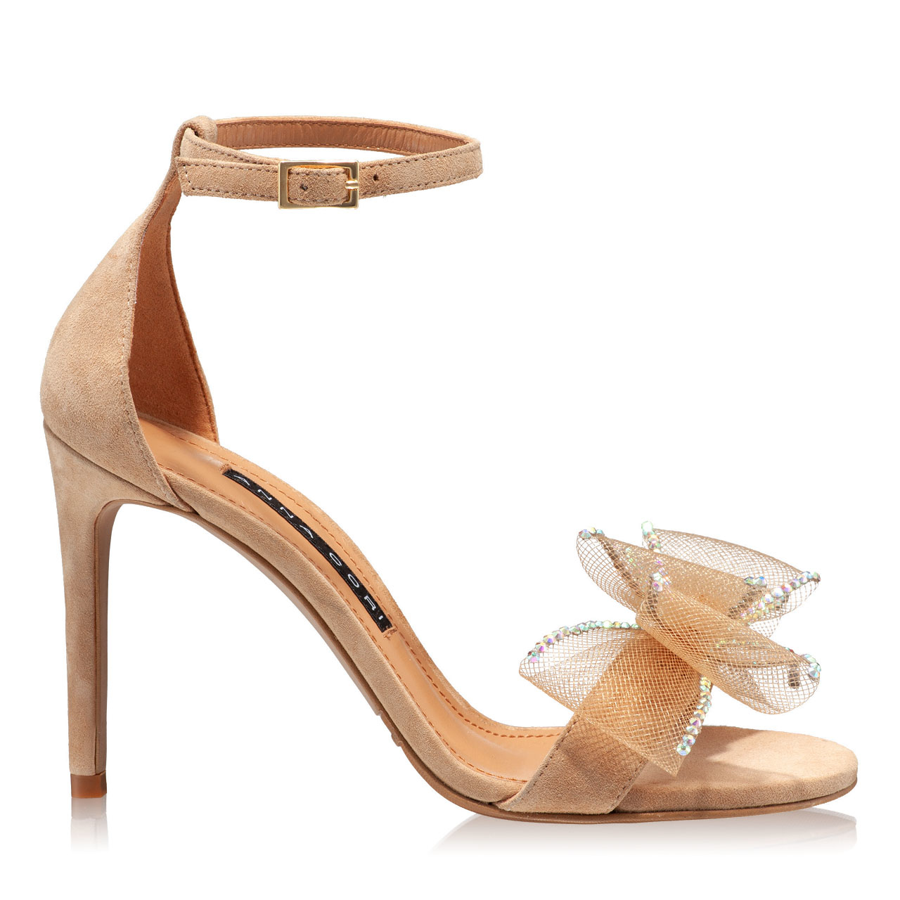 Sandale femei din piele naturala, accesorizate cu fundă prevăzută cu pietre strălucitoare.Se închid cu cataramă laterală și sunt căptușite cu piele naturală.Înălțimea tocului este de 95 mm.