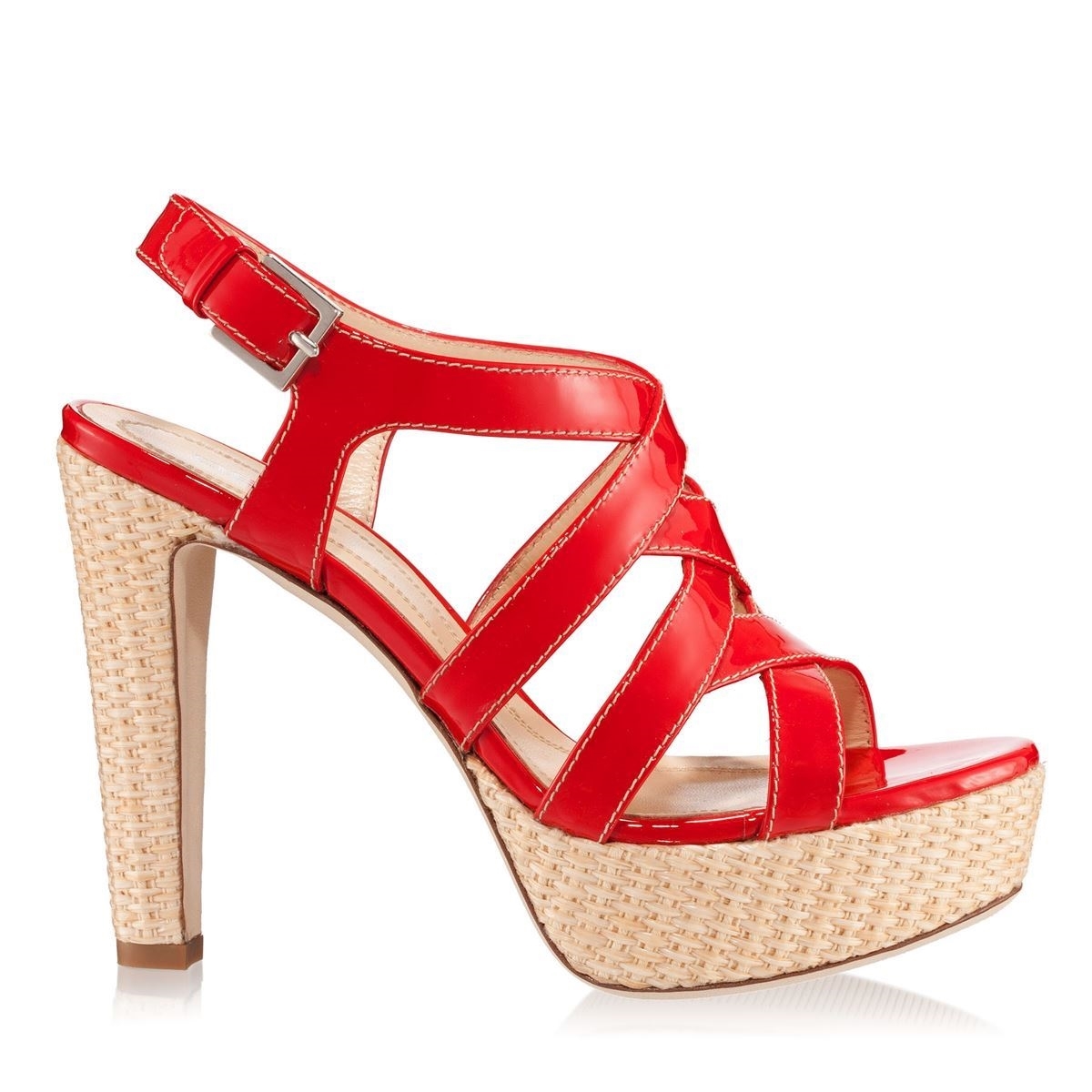 Sandale elegante din piele lacuita. Talpa este din piele ,iar tocul de 95 mm si platforma de 30mm sunt imbracate in rafie. Aceste sandale vor da un plus de rafinament tinutei.